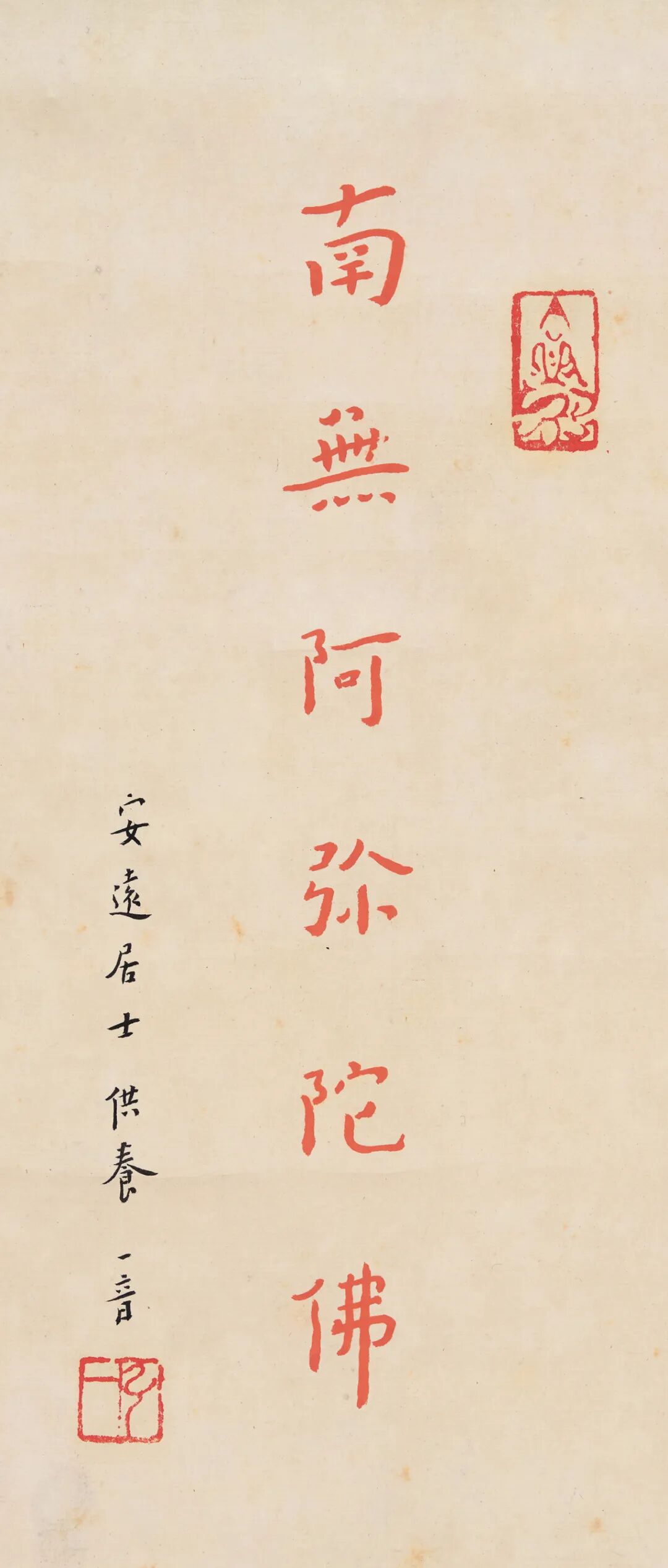 1.上款「如影」法师为永春普济寺僧,出家后苦行精进,尝淡食刺血,供弘一法师书写佛经佛号。2.虞愚旧藏。虞愚(1909-1989),原名德元,字竹园,一字佛心,号北山,中国现代著名的佛学家、因明家、诗人和书法家。幼怀贞敏,感悟佛学。先生少年即入武昌佛学院,从学于太虚大师。后转入厦门大学,专究哲学。其间,曾至闽南佛学院研读,从吕澄学因明。后有机会参谒弘一法师,得其教诲啓迪。终以因明学之研究著称,遂成一代名师大家。【来源】北京华辰2011春季拍卖会lot1554。
