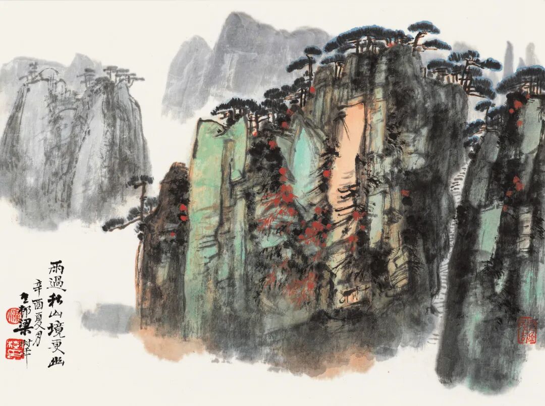 款识:雨过秋山境更幽。辛酉夏月,豆邨梁树年。