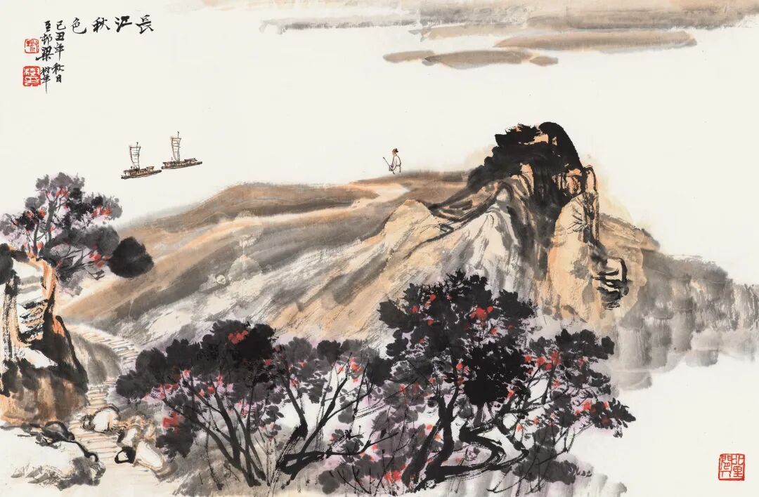 款识:长江秋色。己丑年秋日,豆邨梁树年。