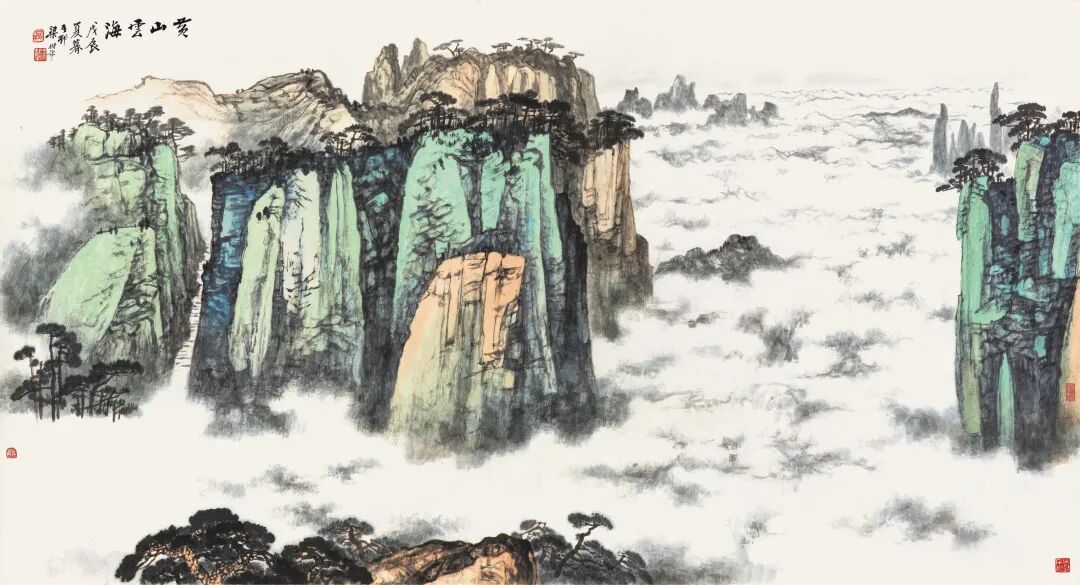 款识:黄山云海。戊辰夏暮,豆邨梁树年。