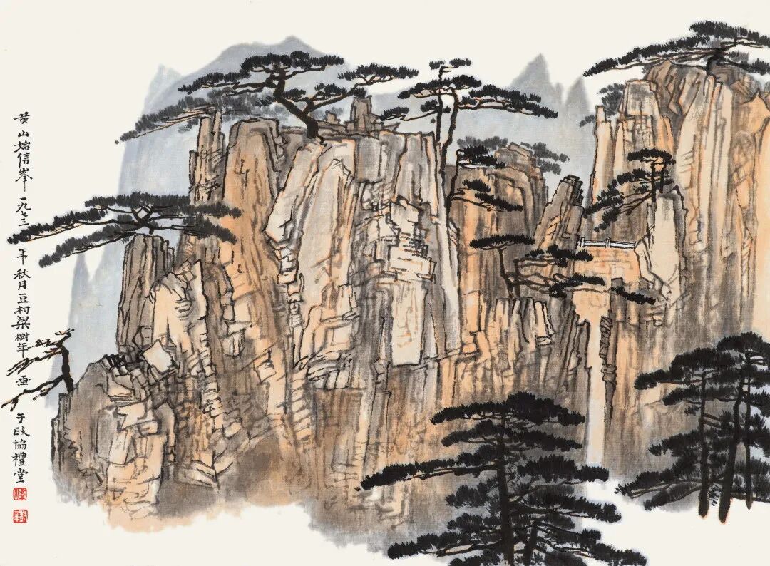 款识:黄山始信峰。一九七三年秋月,豆村梁树年画于政协礼堂。