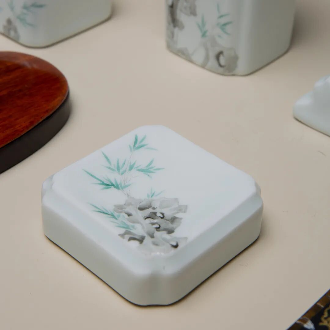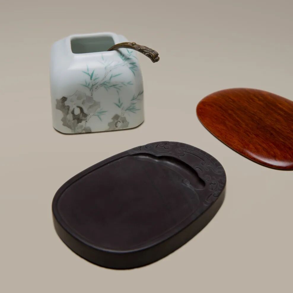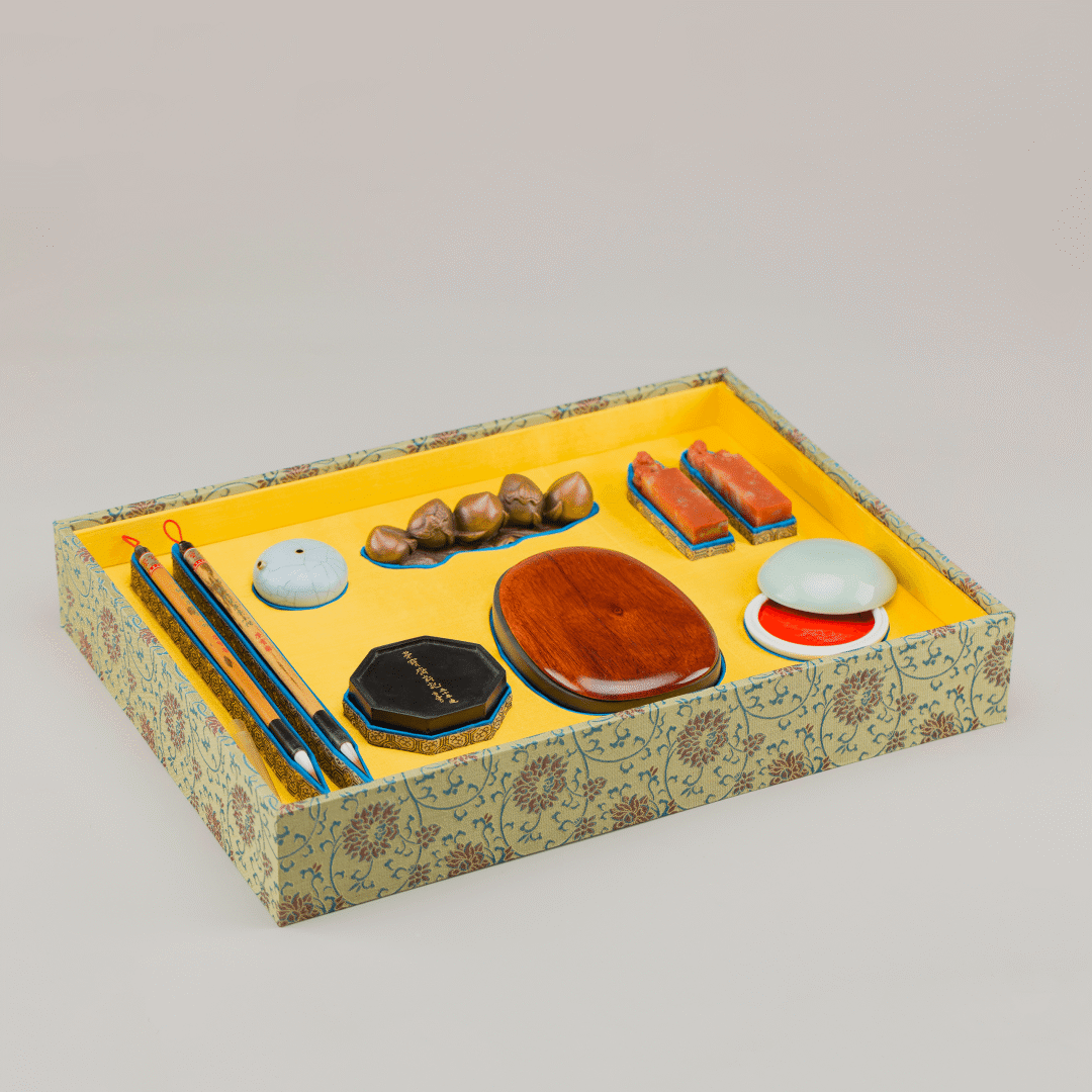 配有两支一号纯北尾狼毫小楷,选纯龙江元尾为毫,湘妃竹制杆,工艺考究,顺手耐用。内含一锭一两贡蝠油烟墨,做工考究,墨版精致。与墨相配,附有铜制饕餮纹墨床一件,纹饰端庄,制作精巧。配套定制四寸端砚,臻选坑仔岩紫石,坚实细腻,下墨爽利发墨如油。下层为手绘五头文具,画工细致,画风淡雅,哑光白釉质地温润。外盒用宋锦制成,采用传统圈托云字套式样,分上下两层,纯手工制作,造型传统典雅。