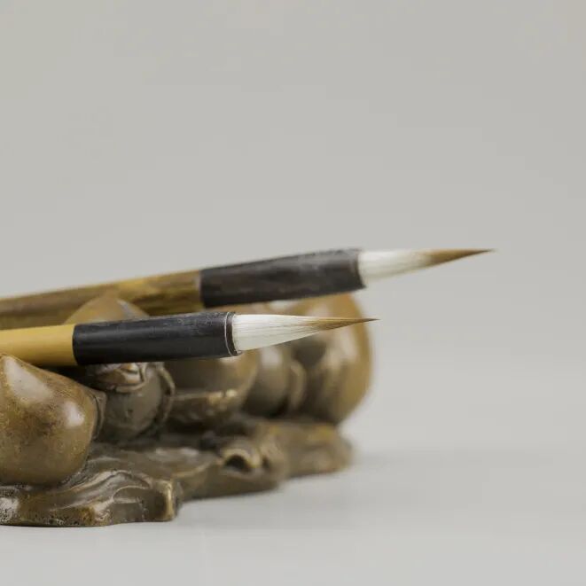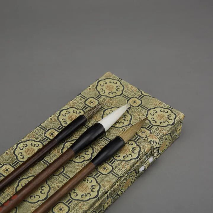 臻选有多年制笔经验的制造商,以多种毛料拼制而成。羊毫圆润饱满,储墨能力强;石獾笔锋挺拔,刚强有力;狼毫弹健,聚锋性好。红木制杆,触感温润,握感扎实,刻字寓意与书画结缘。笔斗及挂头镶嵌牛角,遥相呼应,精工细作。外盒用宋锦制成,采用传统卧囊圈托式样,纯手工制作,造型传统典雅。