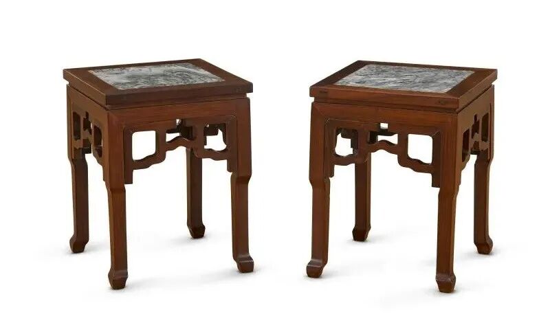 硬木嵌云石方凳一对