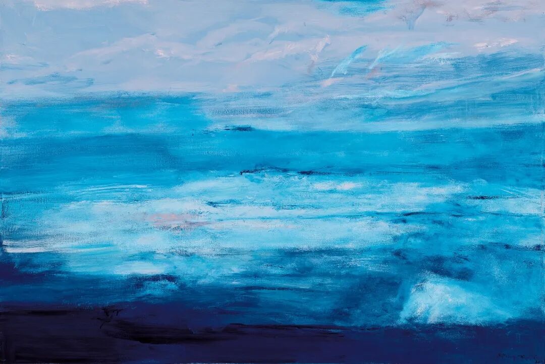 在2004年创作的《皇宮酒店之夜》(Le soir à l’Htel du Palais) 中,赵无极将情感寄托于大海,以法国西南部的大西洋为主题,寻求一种超越真实再现的内在风景和精神平和。立于本作之前,一股深沉而柔和,并具有律动的能量迎面扑来,而微妙的色彩层次更将画作的视觉感变动非常丰富:蓝色基调的色彩柔美而梦幻,从下方的深海蓝色向上,色彩逐层变化:深沉的海蓝、璀璨的宝蓝、澎湃的蔚蓝、宁静的湛蓝以及轻柔的天蓝,搭建出海天一色的结构;并让此幅作品充满了无穷的节奏感,以及自然流动的轻灵感,宛如海风吹拂于尘世。