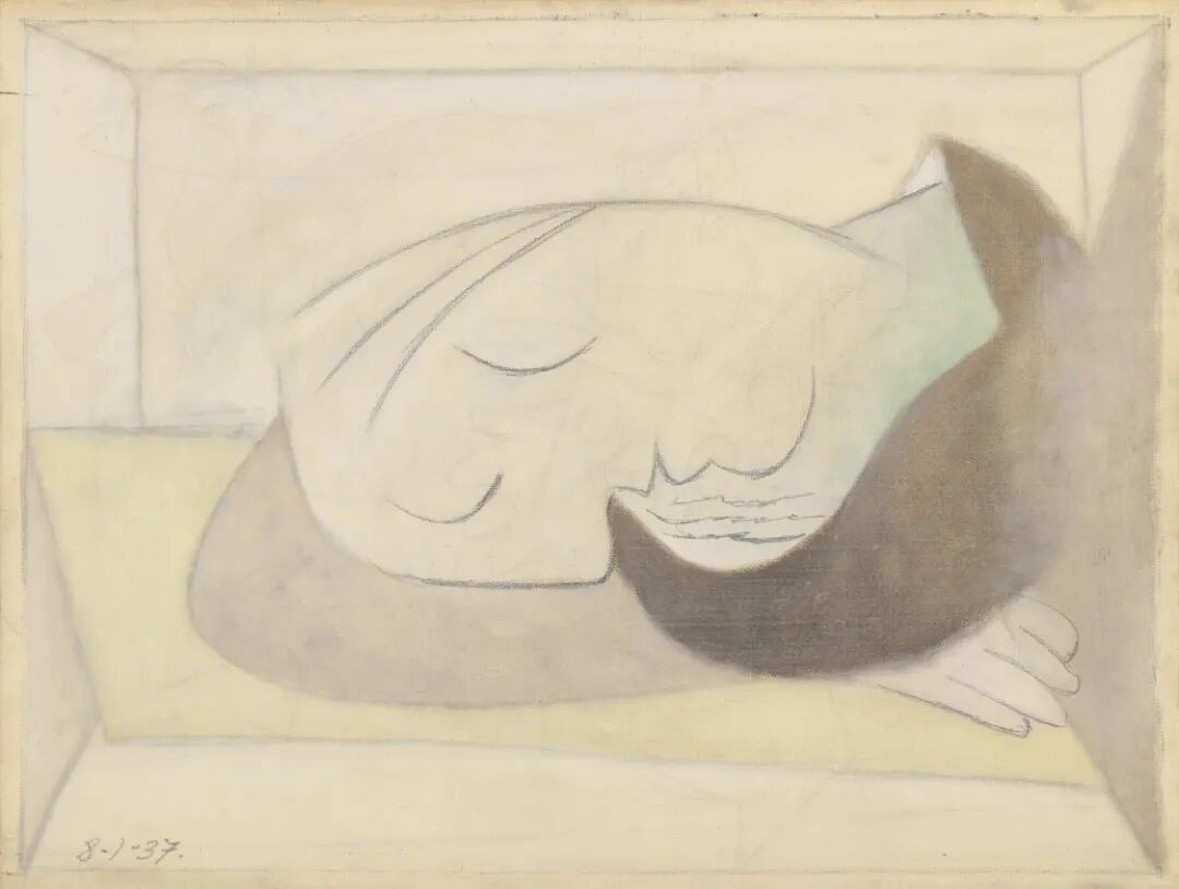 此幅作于1937年的《睡梦中的女子(玛丽·特雷斯·沃尔特)》(Dormeuse (Marie-Thérèse Walter))是西方现代艺术大师毕加索献给一生挚爱兼缪斯女神玛丽·特雷斯·沃尔特的肖像杰作,作品柔情似水,亲密无间。1927年1月8号毕加索与玛丽·特雷斯相遇于巴黎老佛爷百货商店,而此作正绘制于这对爱侣初次相遇的十年之后。如今来看,这次传奇的相遇标志着一场爱情故事的开始,更在日后的岁月里成为毕加索生活与艺术的决定性因素,让他的作品激发出前所未有的创造力,并深刻地影响了毕加索艺术创作的每个领域。