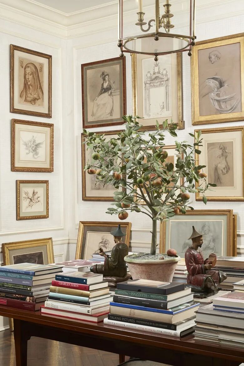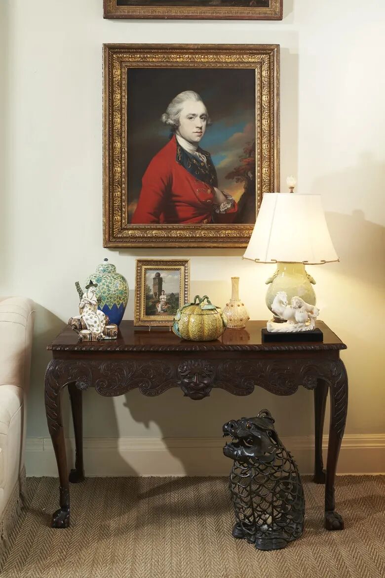 皮耶·鲁埃尔第五大道公寓的一隅,展示了弗朗西斯·柯特斯的画作、日本青铜神兽造型灯笼和其他艺术品