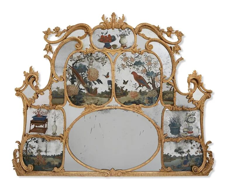 乔治二世时期鎏金木中国反绘玻璃壁炉镜,1760年制。高 147.5 cm.,宽 185.5 cm.。估价:100,000 - 200,000 美元。此拍品将于2022年1月27日在佳士得纽约皮耶·鲁埃尔珍藏拍卖中呈献