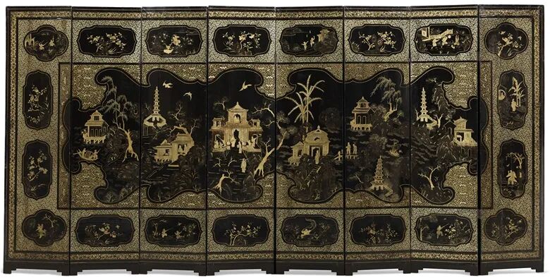 中国鎏金黑漆八折屏风,约十九世纪制。高 212.1 cm.,宽 431.8 cm.。估价:10,000 - 15,000 美元。此拍品将于2022年1月27日在佳士得纽约皮耶·鲁埃尔珍藏拍卖中呈献
