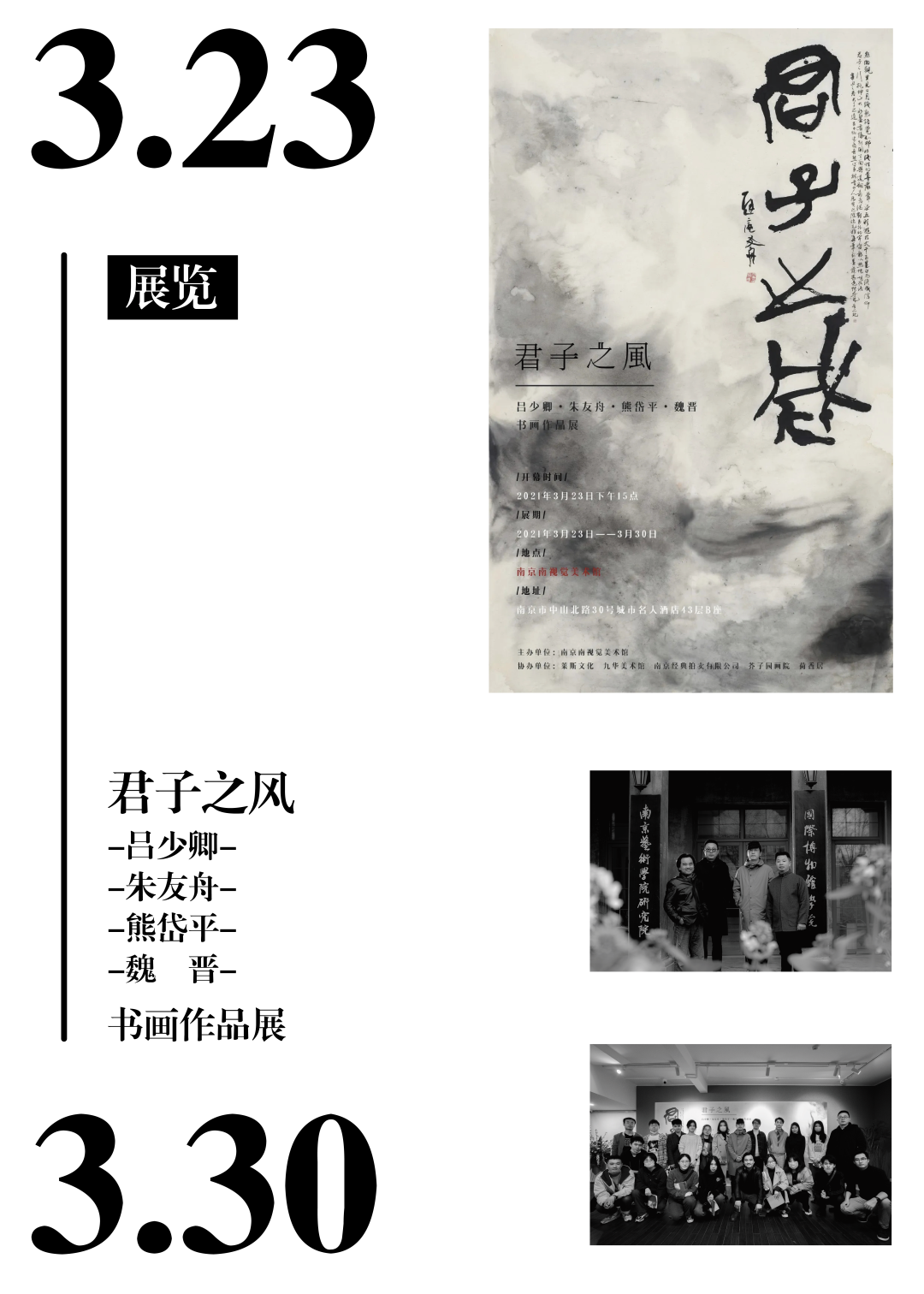 “君子之风”乃吕少卿、朱友舟、熊岱平、魏晋四君携手举办的书画展览。四君之中:吕少卿、熊岱平善画,朱友舟、魏晋能书,书与画结合到展览中相得益彰,如沐清风。