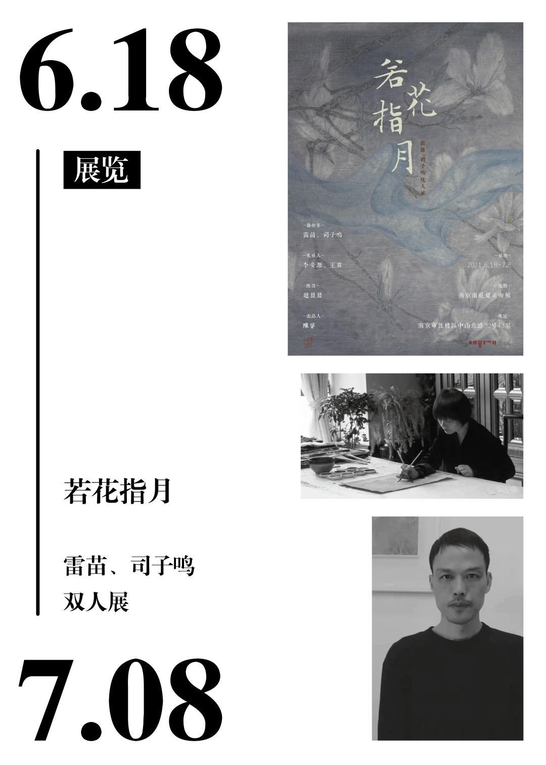 “佛门有言:以手指月,指非月”,因指应见月,缘此形象的“指尖”,明了表达的意象,方能因教观心,悟证画理画趣。于雷苗、司子鸣而言形象的“指尖”是瓶中飞花、月下美人,其空疏娴静之感当能以花自比,借言谓之:若花指月。倏忽望去,雷苗的飞花、司子鸣的美人仿佛都沐浴在灰雅的月光下,不同的是一弯照进了瓶、案、花的洋房子,揉进了些许的虚淡和生意。