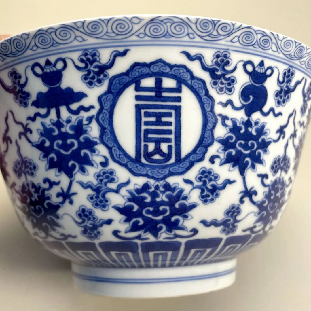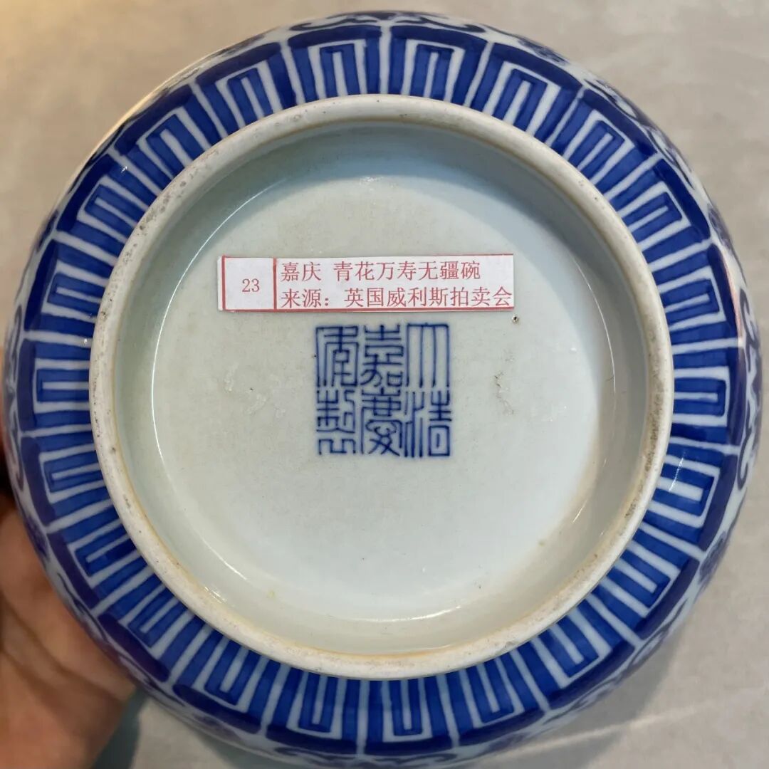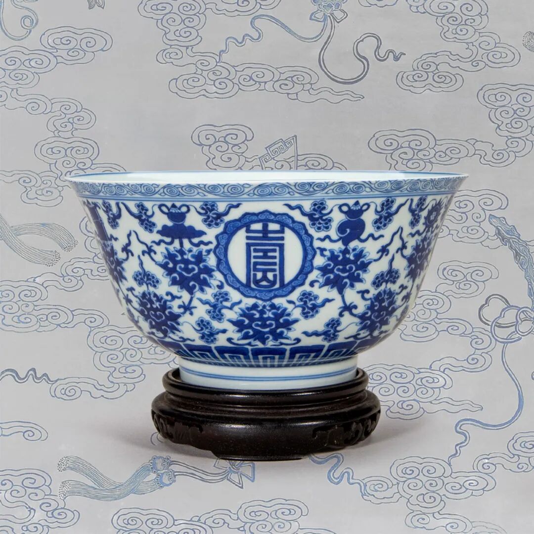 清嘉庆 青花“万寿无疆”八宝碗(连托)