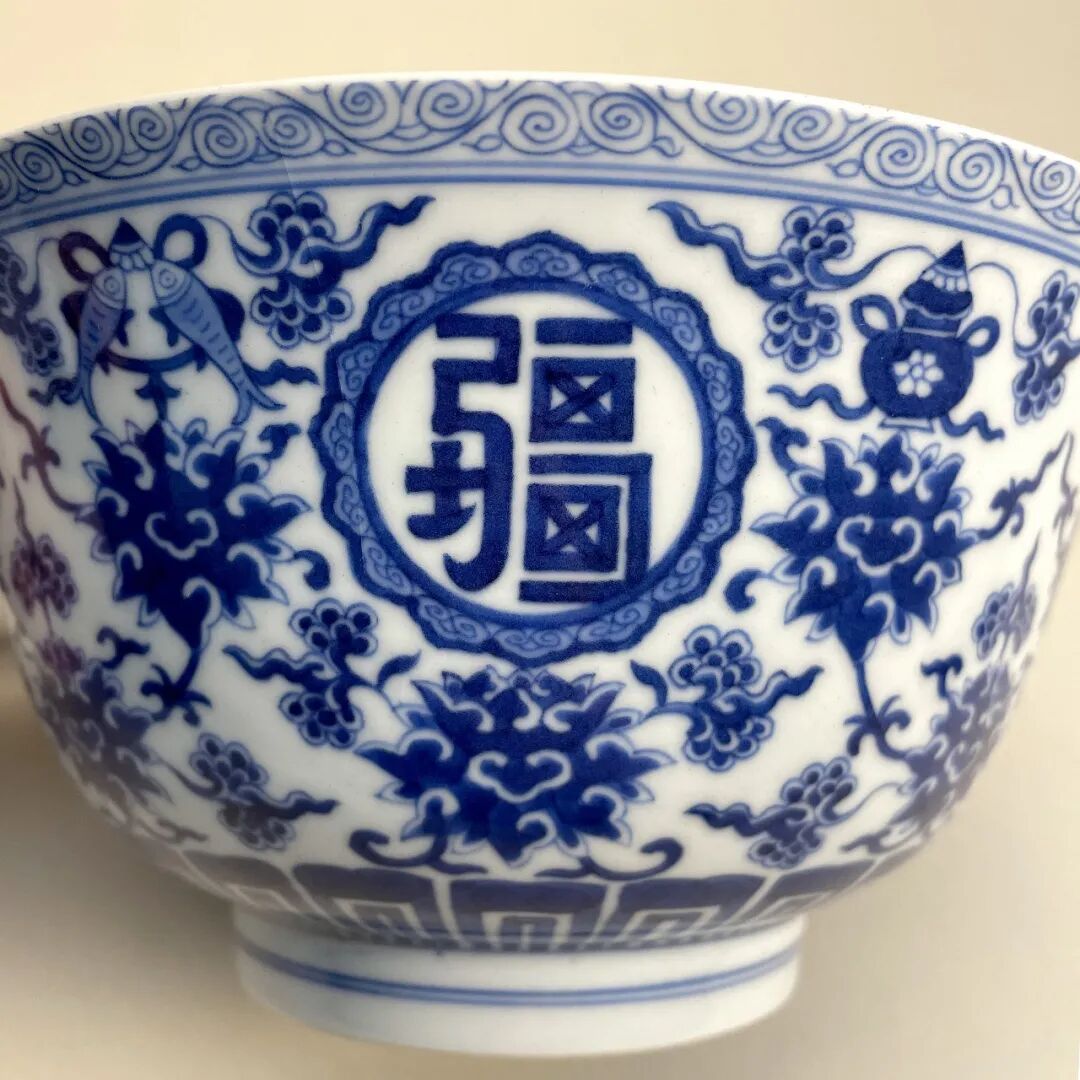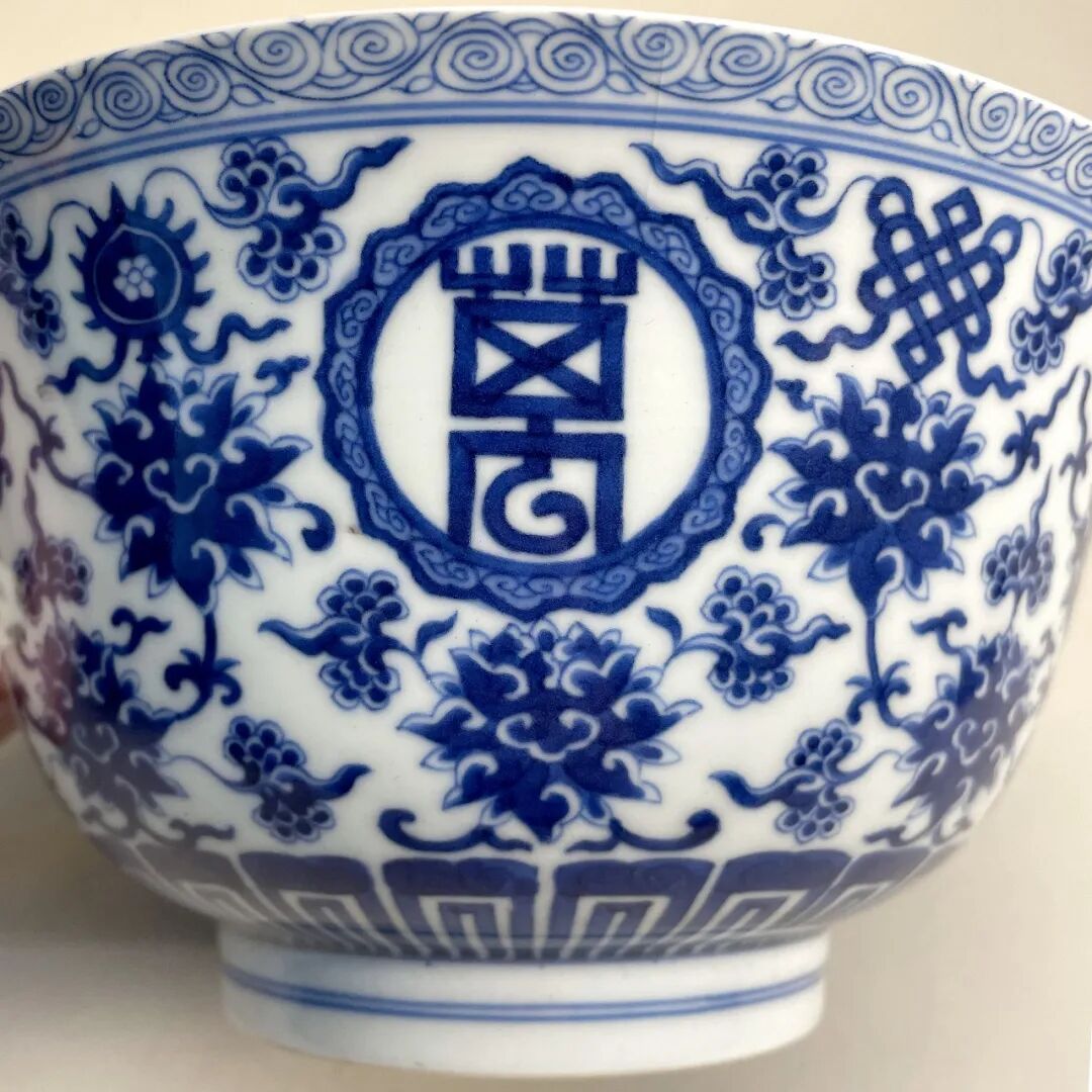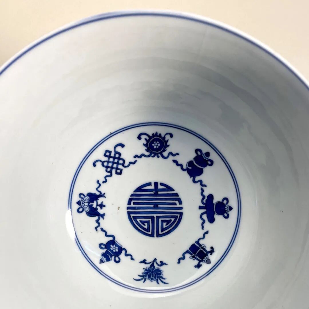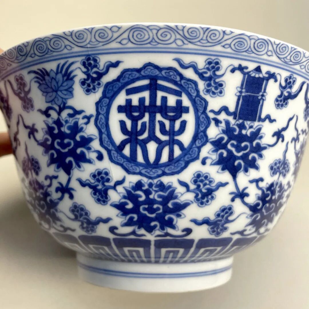 清嘉庆 青花“万寿无疆”八宝碗(连托)
