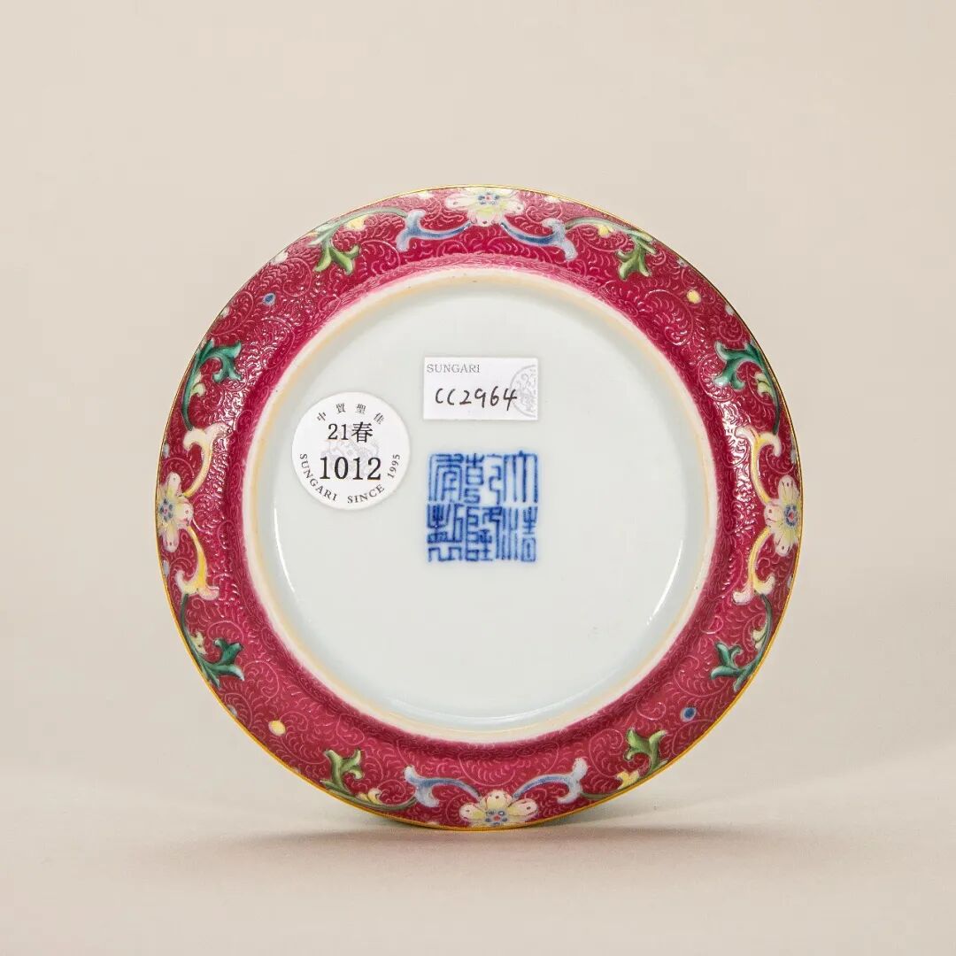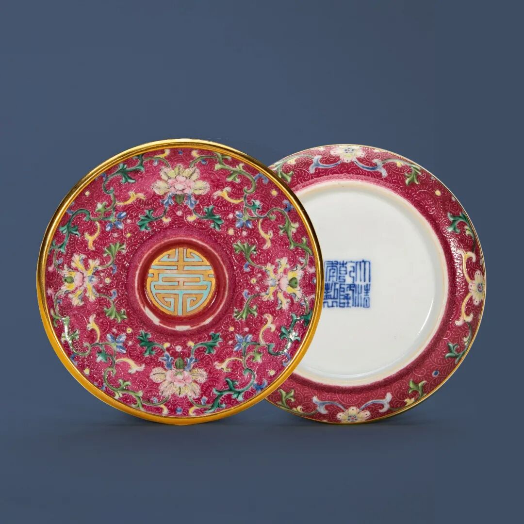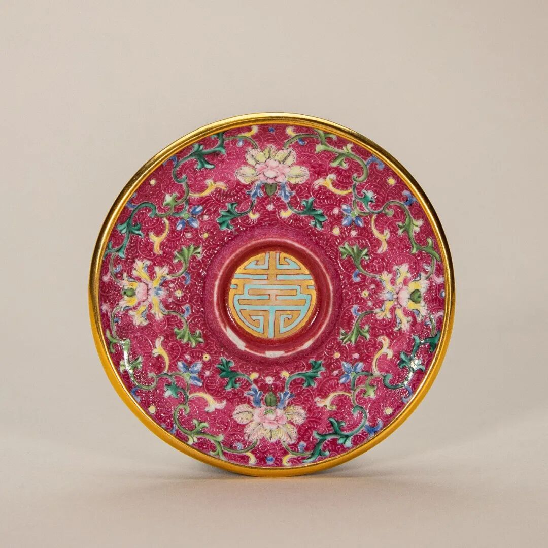 清乾隆胭脂红轧道宝相花“福寿绵长”纹盏托