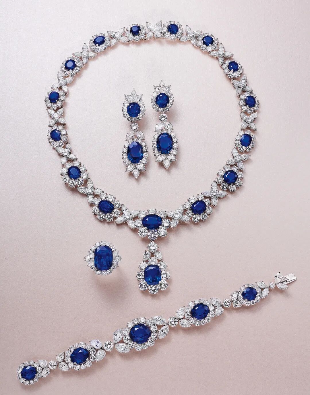 海瑞溫斯頓設計 共重169.80克拉喀什米爾,緬甸及斯里蘭卡藍寶石配鑽石項鍊,戒指,手鏈及耳環套裝