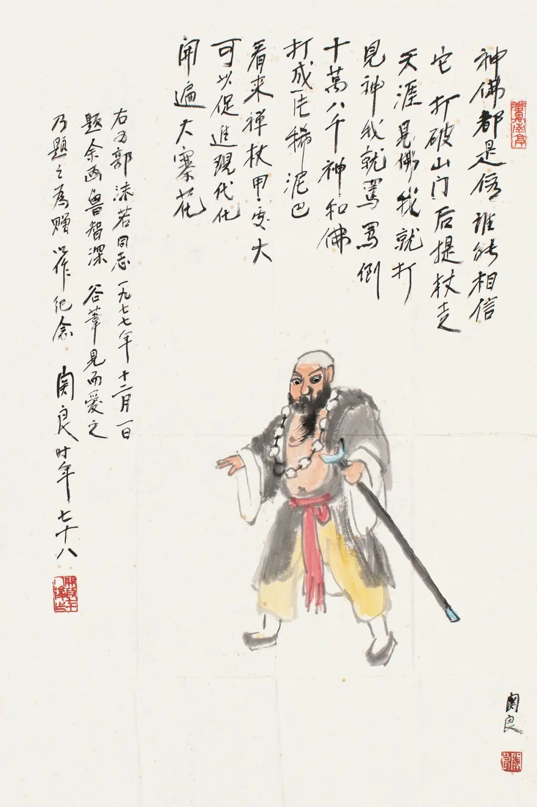 1.神佛都是假,谁能相信它?打破山门后,提杖走天涯,见佛我就打,见神我就骂,骂倒十万八千神和佛,打成一片稀泥巴,看来禅杖用处大,可以促进现代化,开遍大寨花。右为郭沫若同志一九七七年十二月一日题,余画鲁智深,谷苇见而爱之,乃题之为赠以作纪念,关良时年七十八。