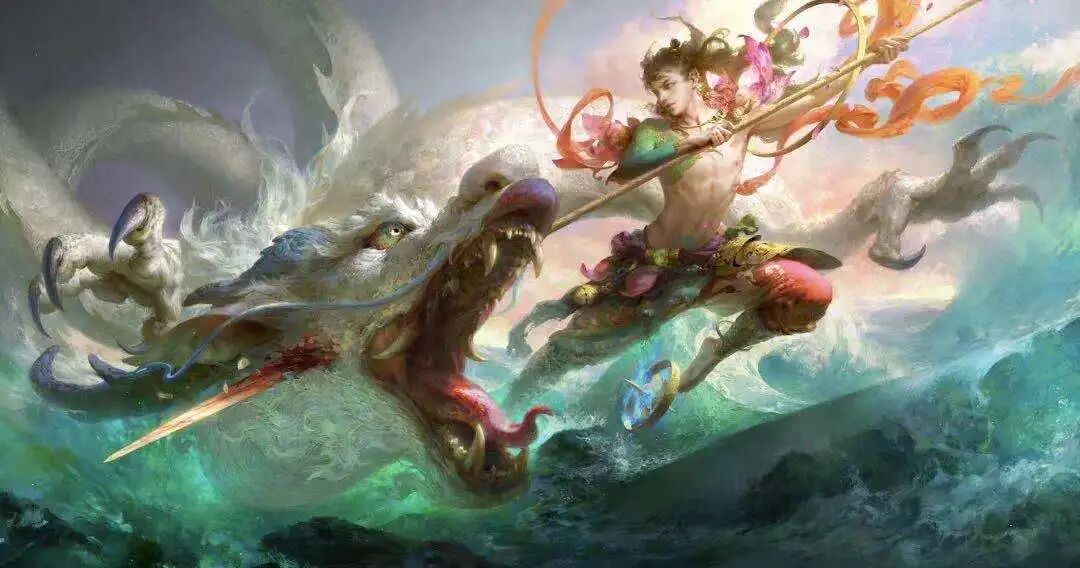 作品源自中国传统神话故事:哪吒闹海。讲述妖龙作祟残害百姓,兴风作浪之时,哪吒对抗妖龙,大闹龙宫的故事。创作此作品,有感于哪吒勇敢无畏,坚持正义,不畏强权,体现中华民族的风骨和一颗拳拳赤子之心。