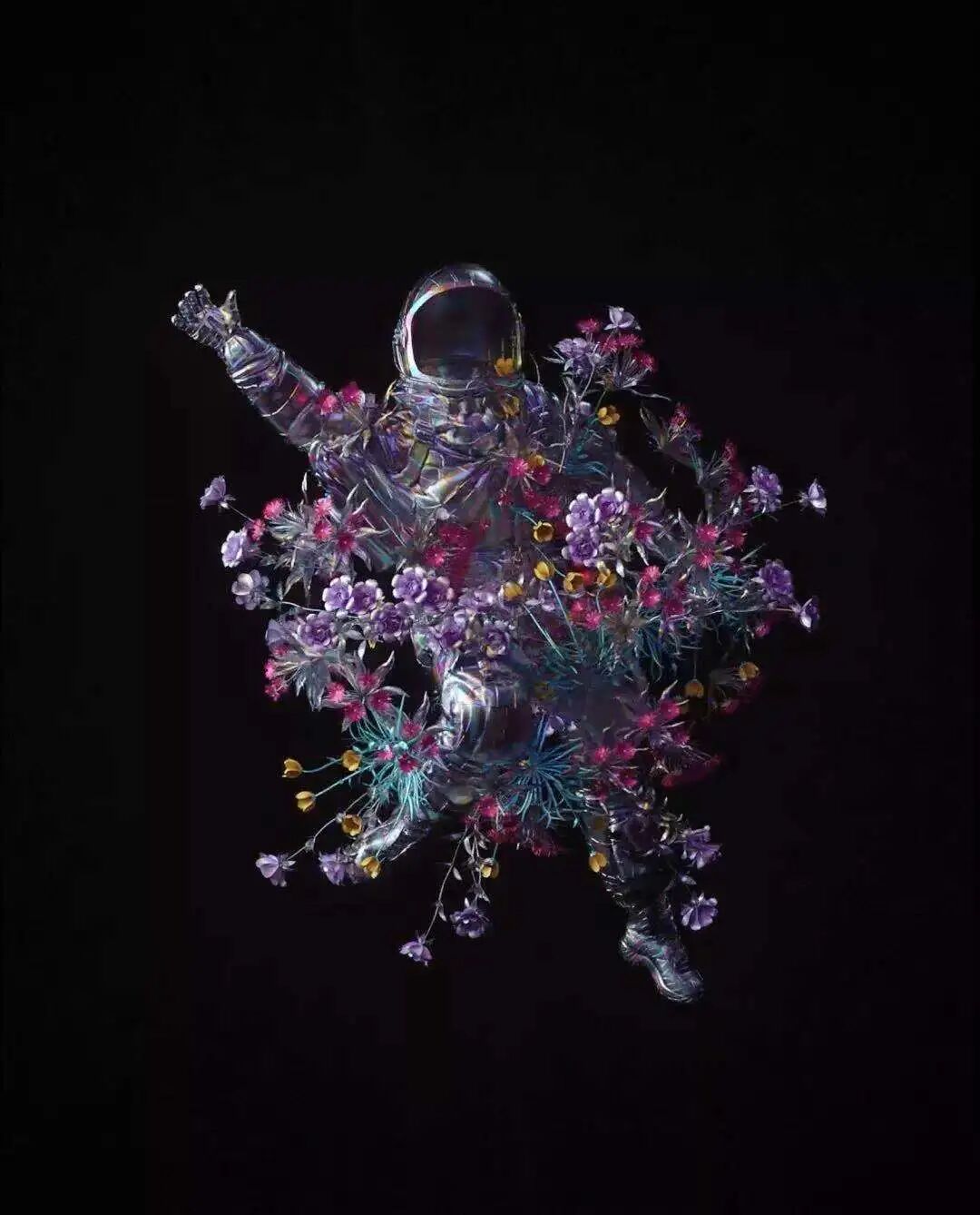 本次上拍的作品《绽放》是《创世纪系列Astro》的其中一件,宇航员Astro在花团锦簇中被发现,以一种唯美又极致简洁的方式向左和向右旋转,仿佛一件以屏幕作为呈现端端机械雕塑。在花团的包围中绽放,需要义无反顾的勇气、厚积薄发。