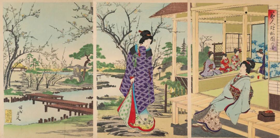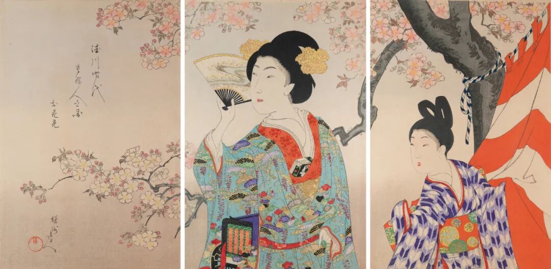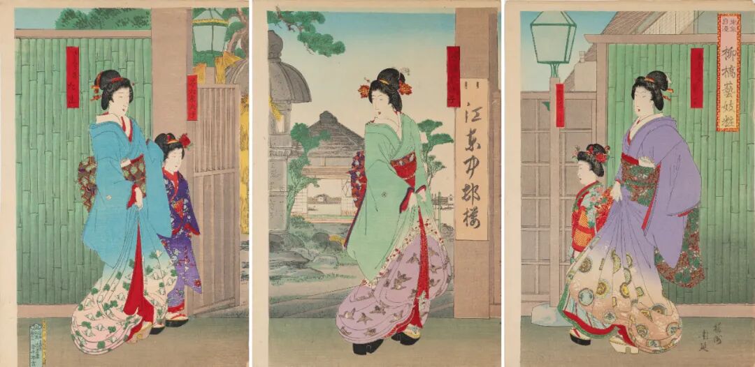 三枚续美人画中,除了大首三枚续之外最贵的格式——“三美人立姿”。紫色颜料中掺入了云母粉,放在亮处 不见光泽,反倒在暗处熠熠生辉。杨洲周延Yōshū Chikanobu(1838-1912),江户后期明治时期浮世绘师。姓桥本,本名直义,通称作太郎,号杨洲、杨洲斋、一鹤斋。先后师从歌川国芳、三代歌川丰国及丰原国周。擅美绘、武者绘及歌舞伎绘,以三联风俗画最为知名,是后期浮世绘画坛重要物。