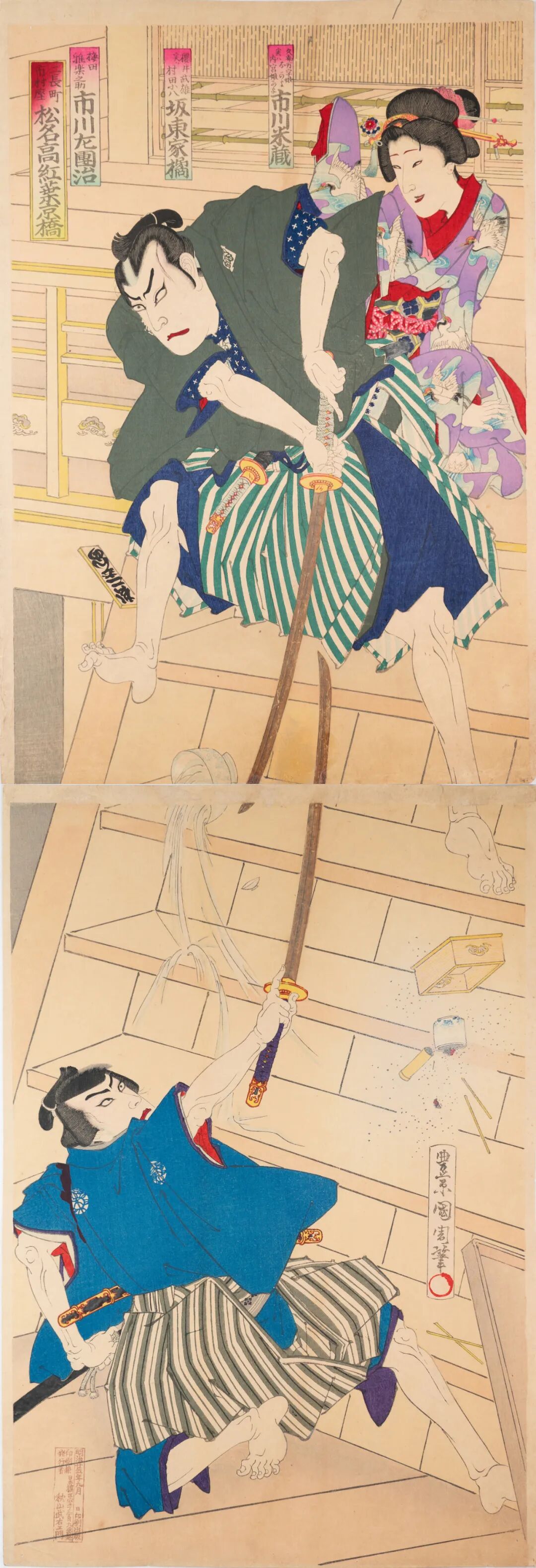 丰原国周(1835-1900)二长町市村座 松名高红叶京桥张力十足的场面,上下的窄型构图更好地将观者的视线集中在画面中央;上面两个人物张开身体,而下部单薄的一个人物又极力压低身体,这样的构图安排,提供了画面压迫感。值得瞩目的是,此作使用了一项比较少见的技法,从被踢翻的炉子中,香灰倾撒而出,而印刷师使用了胡粉飞白,做出了立体感和香灰弥漫的朦胧。肉眼看是十二分的精彩。丰原国周Toyohara Kunichika(1835-1900),幕末明治时期著名浮世绘师。丰原周信及歌川国贞(三代歌川丰国)的门人。本姓荒川,俗称八十八。一生传奇跌宕,据说与超过40位妻子离异,搬过83次家。他的歌舞伎绘手法奇特,造型新颖,给浮世绘画坛和役者绘界带来强烈冲击。其作品最大的特征在于不仅以夸张的手法表现演员的形象与动态,更通过对个性的渲染表现其艺术品质、风格以及角色内在的精神。