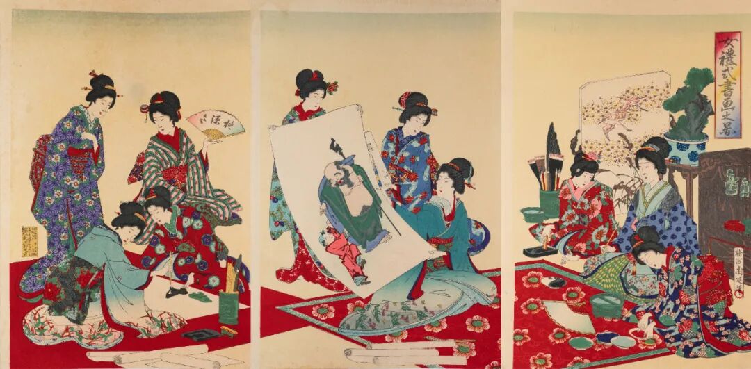 如同标题“女礼式书画之図”,最右侧的女子正提笔思忖该在扇子上画什么好,身旁的年轻女子正在为她磨墨,中间三位正在观赏一幅“布袋和尚”的画作,最左侧跪坐的女子正在书写着什么,面前的朋友则为她固定纸张。该作生动地记录了贵族女子们陶冶情操的场景。