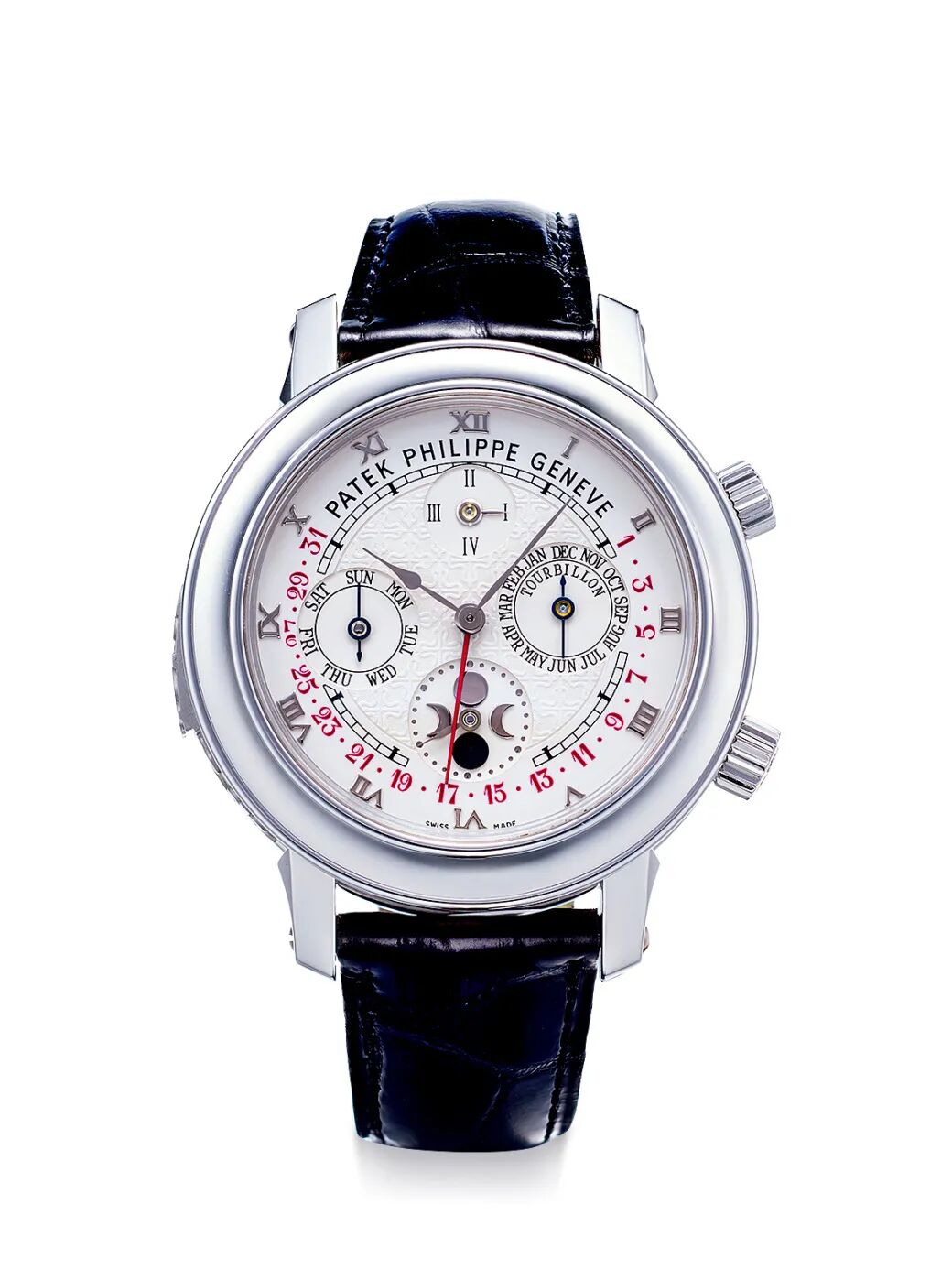 非常瑰麗及重要,鉑金雙錶盤腕錶,備十二項複雜功能:包括大教堂音簧三問報時、陀飛輪、萬年曆、逆返日曆、星空圖、月相、星體軌跡、恆星時,型號5002P,年份約2011,附原廠後補證書