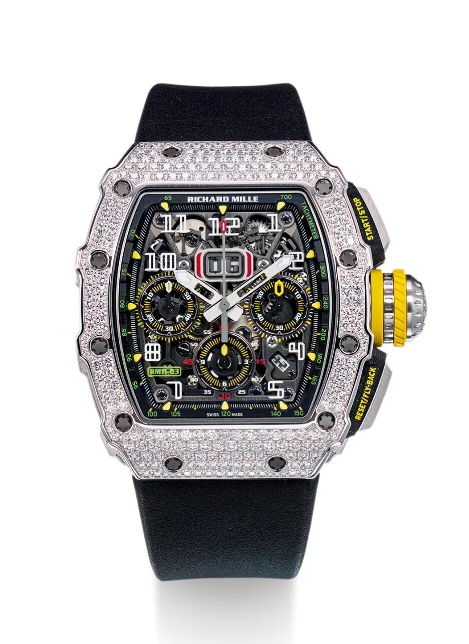 精美吸引,白金鑲鑽石酒桶形鏤空自動飛返計時碼錶,備小秒針、日期及月份顯示,「RM11-03」,年份約 2020,附原廠證書及錶盒