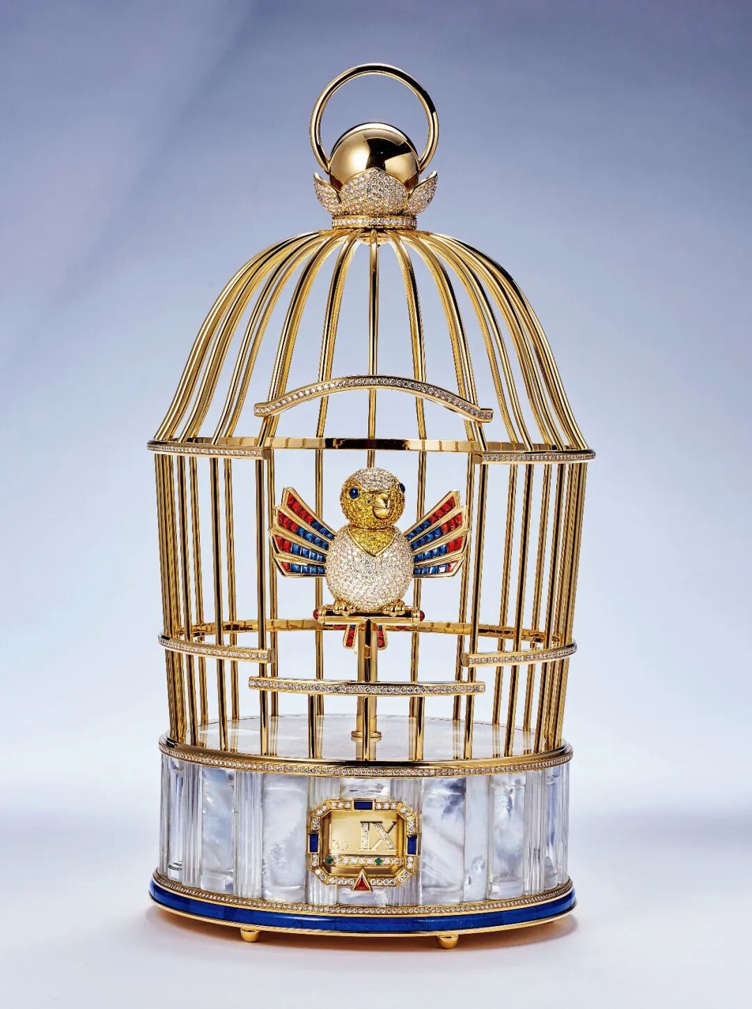 獨一無二,非常瑰麗,黃金鑲鑽石、藍寶石及紅寶石自由鳥座鐘,備黃金鑲綠寶石、貝母及青金石鳥籠裝飾,「The Freed Bird」,型號HPH00024,年份約1999,附設計原稿、原廠證書及錶盒