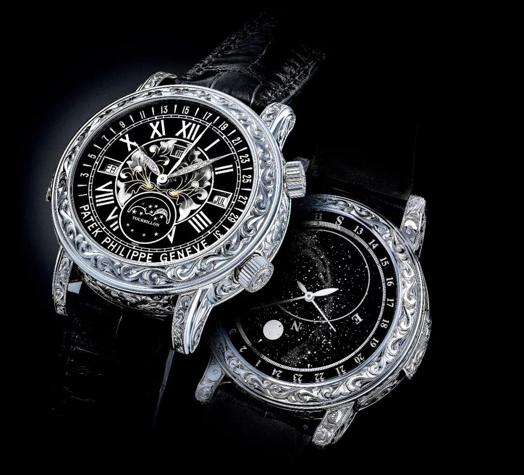 卓爾不凡、瑰麗罕有,白金雙錶盤天文機械腕錶,備琺瑯及手工雕飾工藝,及十二項複雜功能:包括大教堂音簧三問報時、陀飛輪、萬年曆、逆返日曆、星空圖、月相、星體軌跡、恆星時顯示,「超級複雜功能時計」,型號 6002G,年份約 2019,附原廠證書、調校針、白金手工雕刻袖扣一對及錶盒,單封狀態