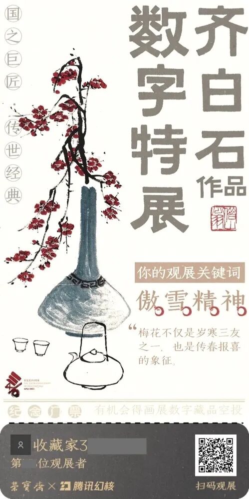 值壬寅新春之际,荣宝斋携手腾讯幻核推出馆藏佳作——齐白石数字藏品和新年线上数字特展。这也是荣宝斋首次正式进入数字艺术藏品领域,以数字科技再现齐老传世巨作,献礼荣宝斋350周年。5款官方数字藏品共12500份,2月9日下午3点开售即秒空!