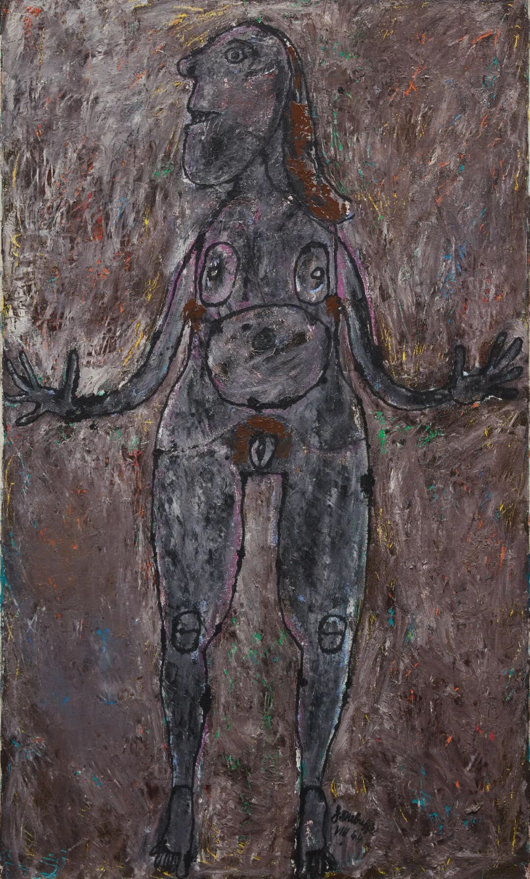 《大型炭黑色裸像》是尚·杜布菲创作的首幅裸体大画,也是麦克罗威收藏中的唯一一件杜布菲作品,曾经在主要回顾展中展出。作品创作于1944年,正是杜布菲回归绘画创作两年后——经过专心经营家族葡萄酒生意的八年间歇期之后。带着激烈的原生艺术(Art Brut)风格,杜布菲对女性裸体的描绘并非故意苛刻,而是对西方传统美学标准发起挑战。