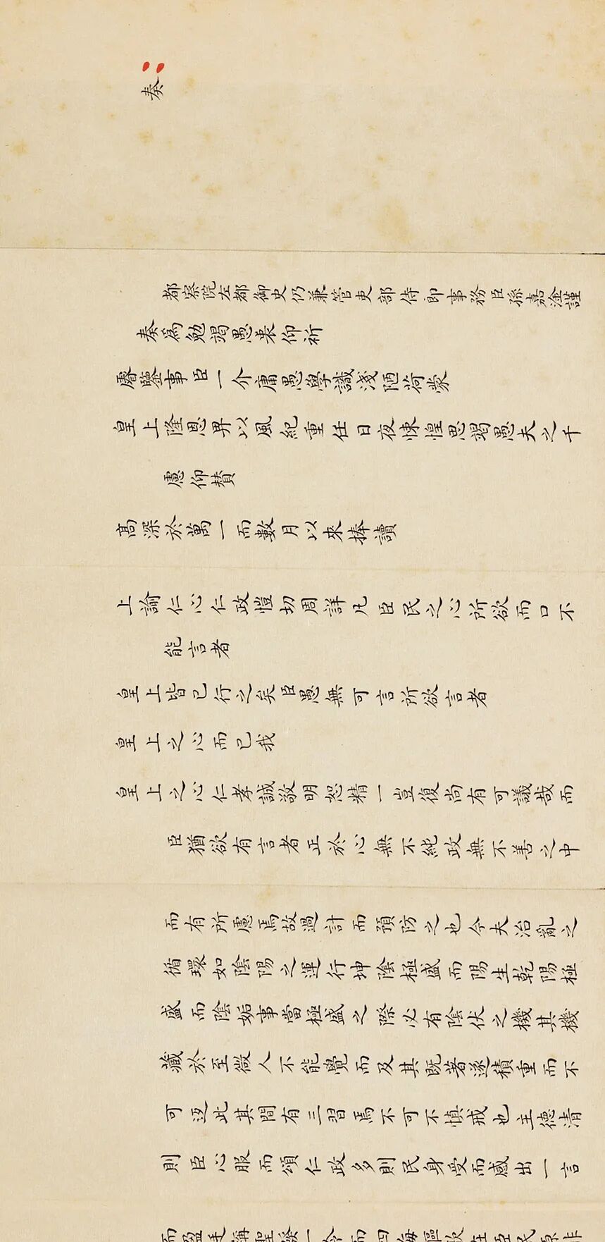 臣一介庸愚,学识浅陋,荷蒙风纪重任,日夜悚惶。思竭愚夫之千虑,仰赞高深于万一,而数月以来,捧读上谕,仁心仁政,恺切周详,凡臣民之心所欲,而口不能言者,皇上皆已行之矣,臣愚无可言所欲言者,皇上之心而已我。皇上之心,仁孝诚敬,明恕精一岂复尚有可议哉?而臣犹欲有言者,正于心无不纯,政无不善之中,而有所虑焉,故过计而欲预防之也。