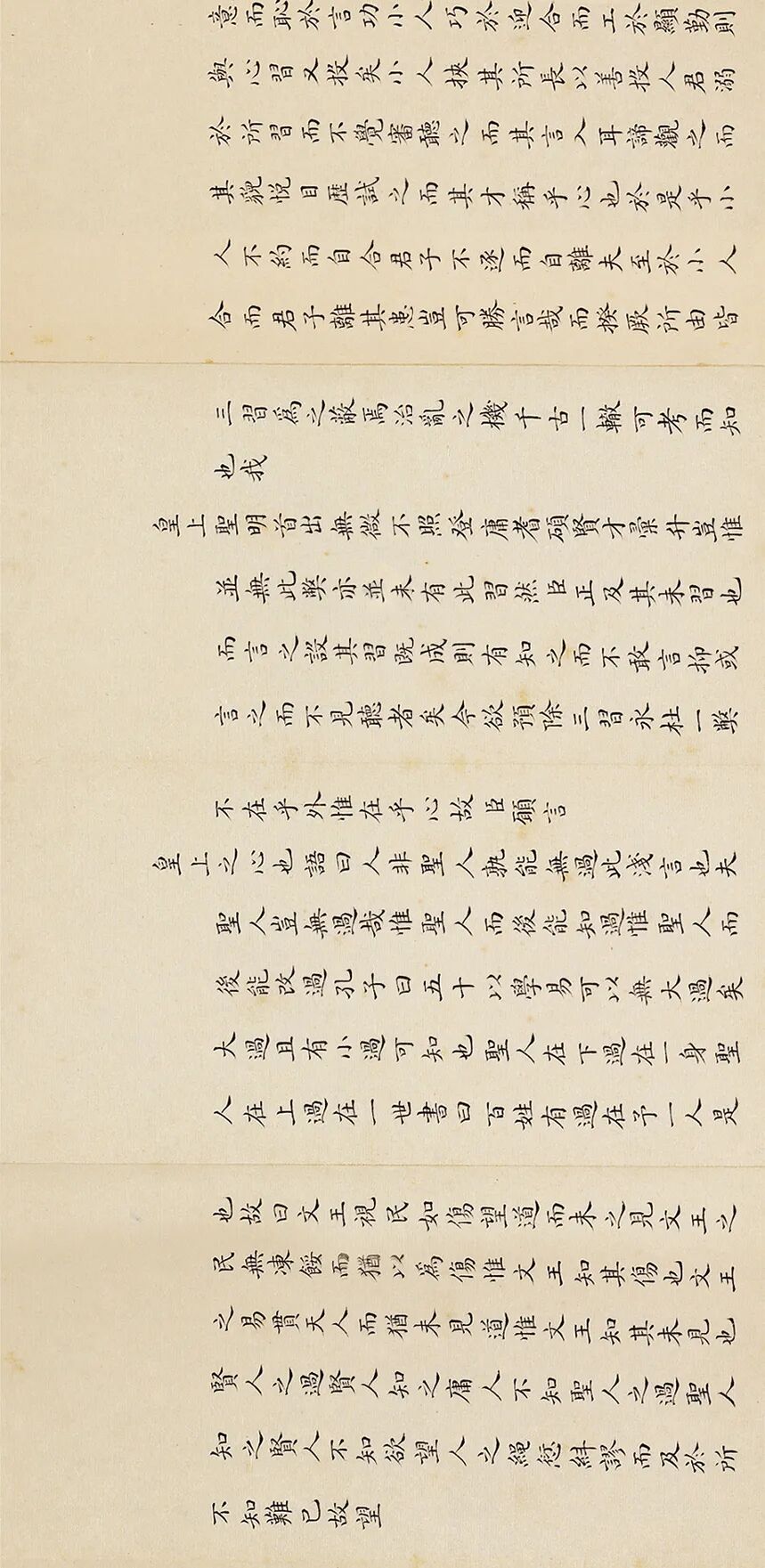 贤人之过,贤人知之,庸人不知。圣人之过,圣人知之,贤人不知。欲望人之绳愆纠谬,而及于其所不知,难已!故望皇上圣心自懔之也。危微之辨精,而后知执中难允。一念戏豫渝天之命何时敢自宽也。怀保之愿宏,而后知民隐难周。一夫不获时予之辜,何时可自慰也。谨几存诚,返之己而真知其不足。老安少怀,验之世而实见其未能。夫而后欣然不敢以自是。不敢自是之意,流贯于用人行政之间,夫而后知谏争切磋,爱我良深,而谀悦为容者,愚己而陷之阱也。夫而后知严惮匡拂益我良多而顺从不造者推已而坠之渊也。耳目之习除,而便辟善佞之态,一见而若浼。取舍之极定,而嗜好宴安功利之说,无缘以相投,夫而后治臻于郅隆,化成于久道也。