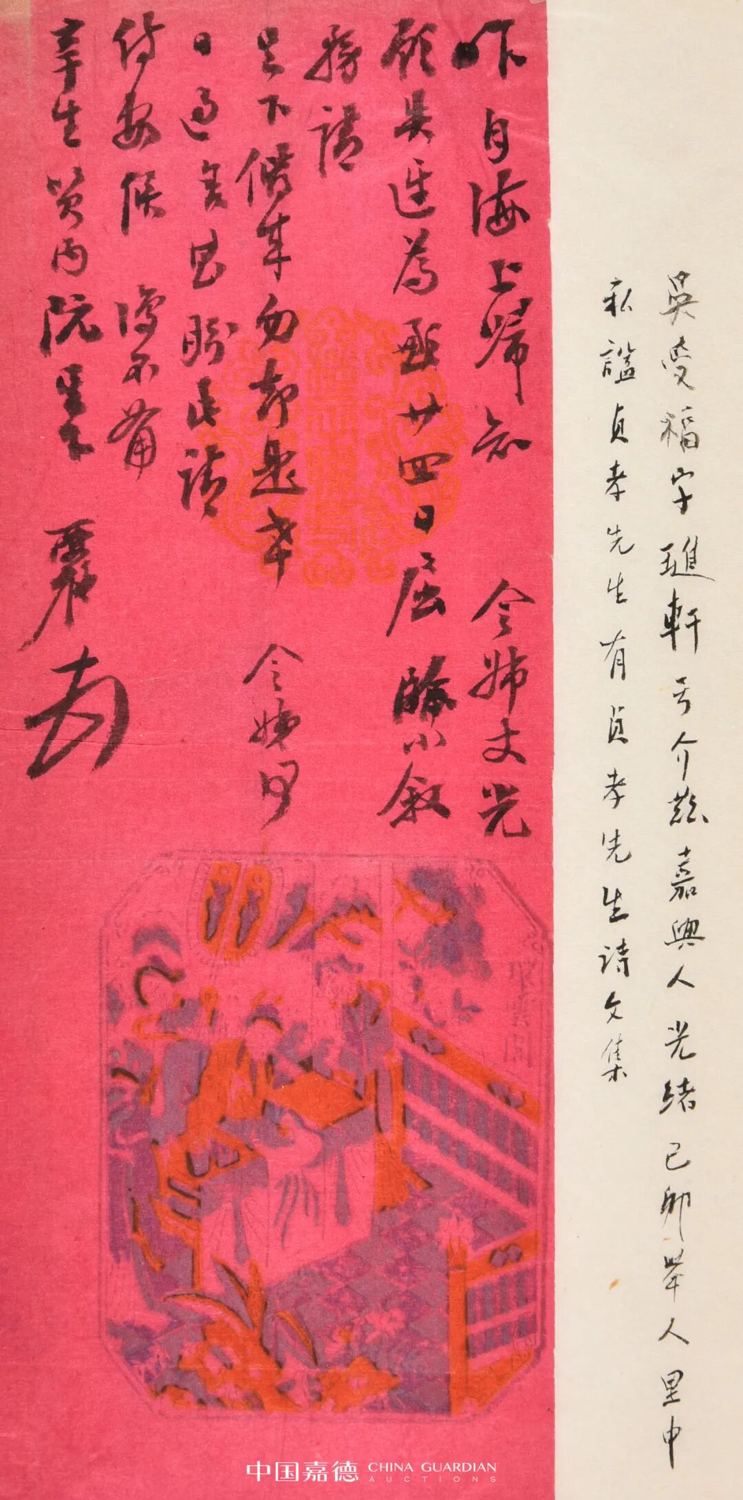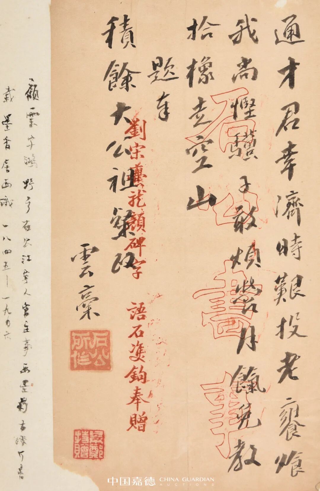12.5×22.6 cm、12.5×22.7 cm此件先后经潘景郑、郑逸梅递藏,钤有"景郑持赠"印章,应为潘景郑赠与郑逸梅,其中顾云致徐乃昌诗稿另有郑逸梅边题注明作者生平。内含:1、顾云致徐乃昌七言诗稿1页,钤有"石公所作"印章。2、李宗诚致桐侯夫子大人函1通2页,所用为暗纹笺纸,信中请夫子对其小子李荣绶严加训诲。顾云(1845-1906),字子鹏,号石公,行五,人称江东顾五,江苏江宁人。攻古文词,亦豪于诗。晚游吉林,为将军长顺修省志,事竣,获保教职,选宜兴训导,署常州教授。生平雅好交游,文酒之会,与郑孝胥相交甚密。有《盋山诗录》传于世。