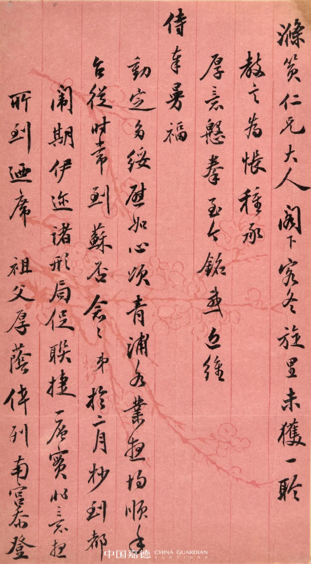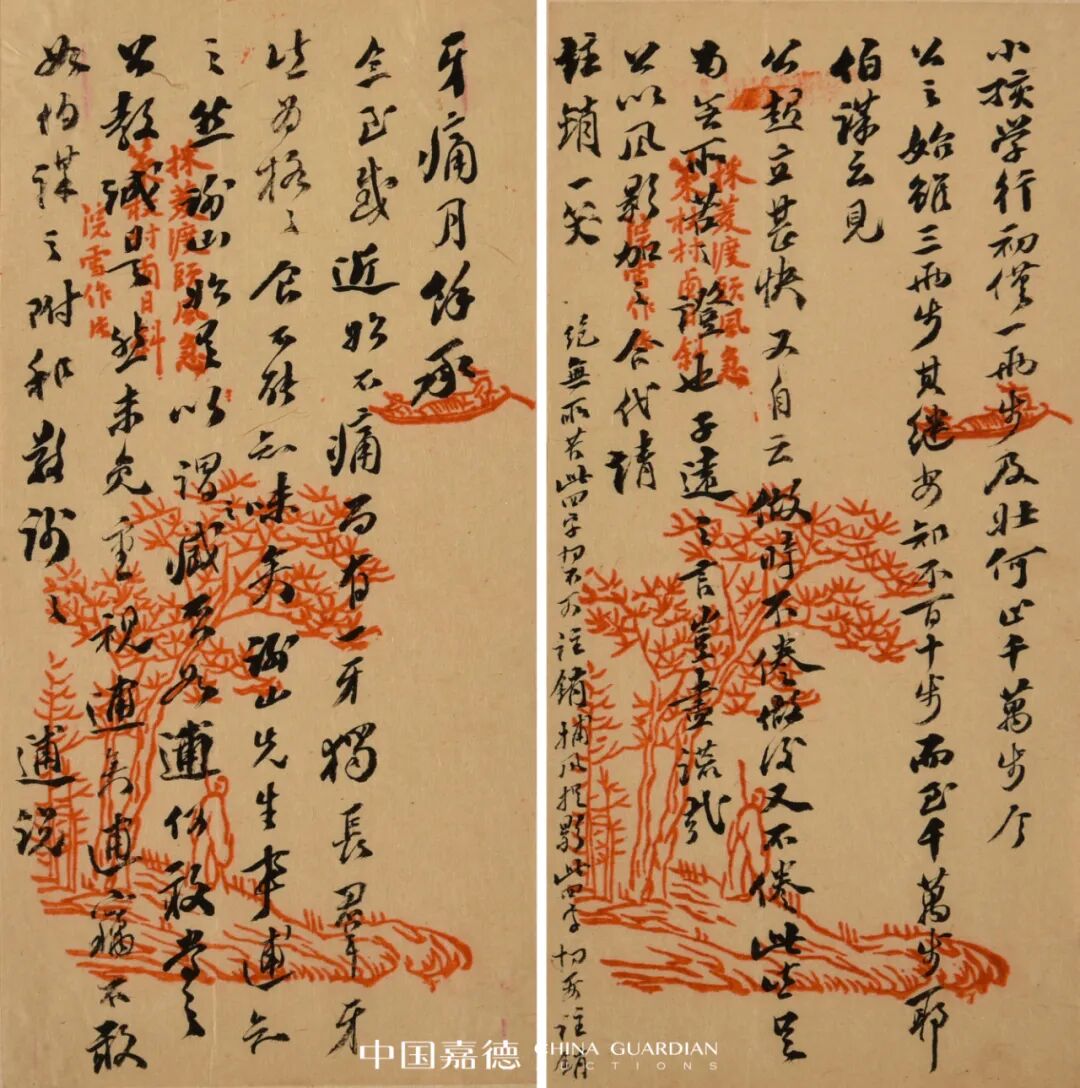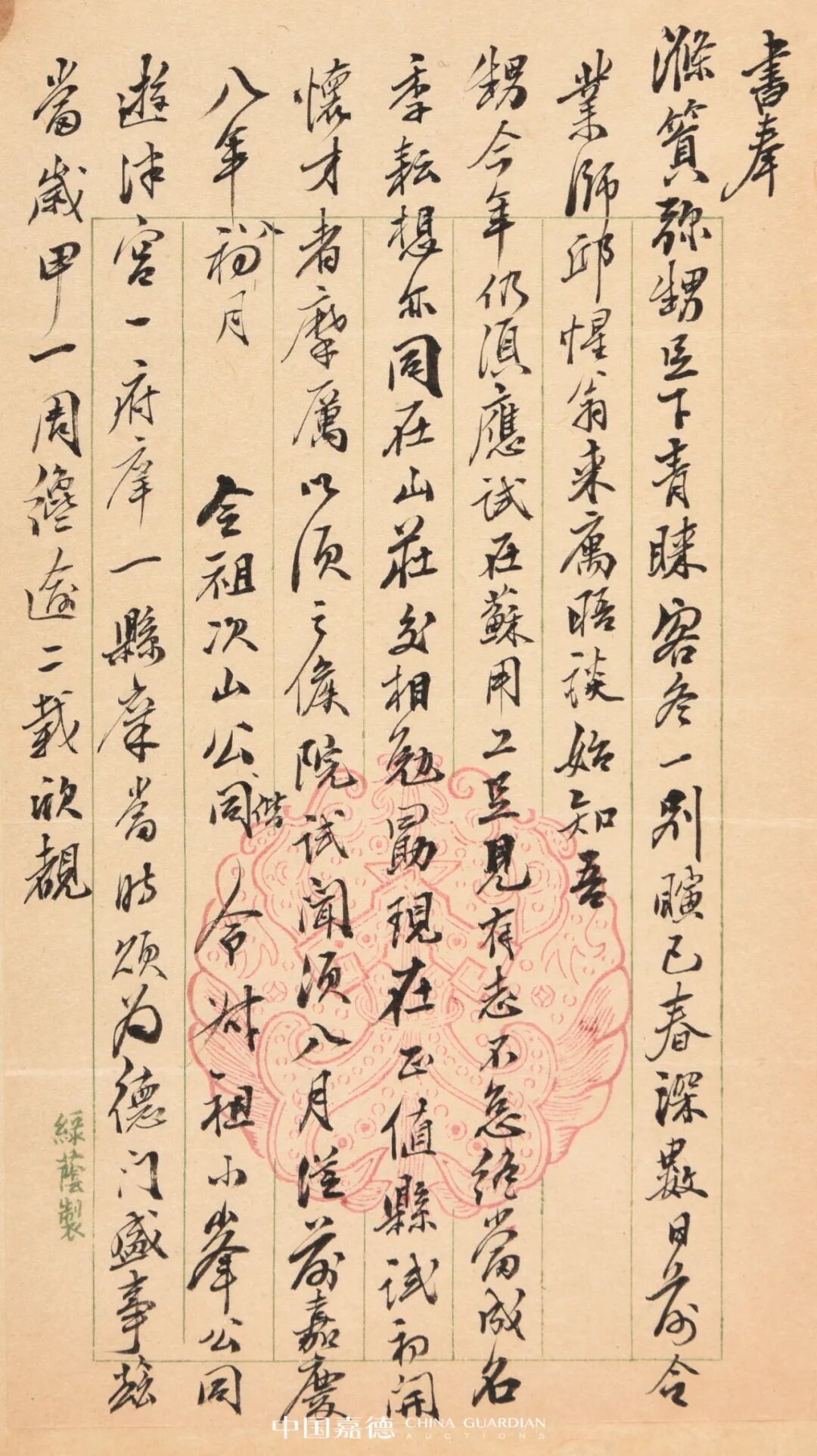 1、盛景璿致梁鼎芬函2通4页,论及抄诗、题扇面、书籍送寄等事。2、盛景璿致"清士我师"等人函2通3页,谈及牙疼月余、鉴赏其所作为,言"小孩学步,初行仅一两步,及壮何止千万步。今公之始,虽三两步,其继安知不百十步而至千万步耶"。盛景璿(1880-1929),字季莹,一字淡逋,号芰舲、雪友、濠叟、遁斋、剑气楼,广东番禺人。热衷于文史和书画,喜藏书,其"濠堂"藏书楼有藏书数十架,间有宋元残本,另有广东地方史志、诗文及书画。晚年藏书被同里藏书家陈融所购,归于"黄梅华屋"。●请您于参与拍卖活动当日24小时前完成账户注册并交纳保证金。●E-BIDDING提供预约鉴赏服务,敬请关注“中国嘉德网拍”服务号预约。鉴赏地点:嘉德艺术中心三层、B2层。●中国嘉德为竞买人提供查看拍卖标的实物的条件,务请竞买人亲自审看。本公司对拍卖标的不承担瑕疵担保责任。请拨打1501000622015910807786![]()