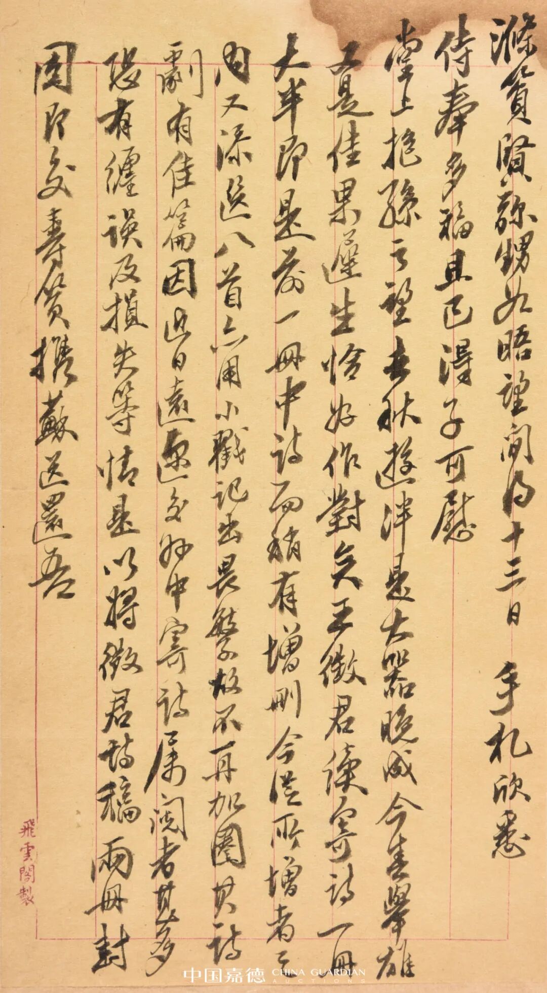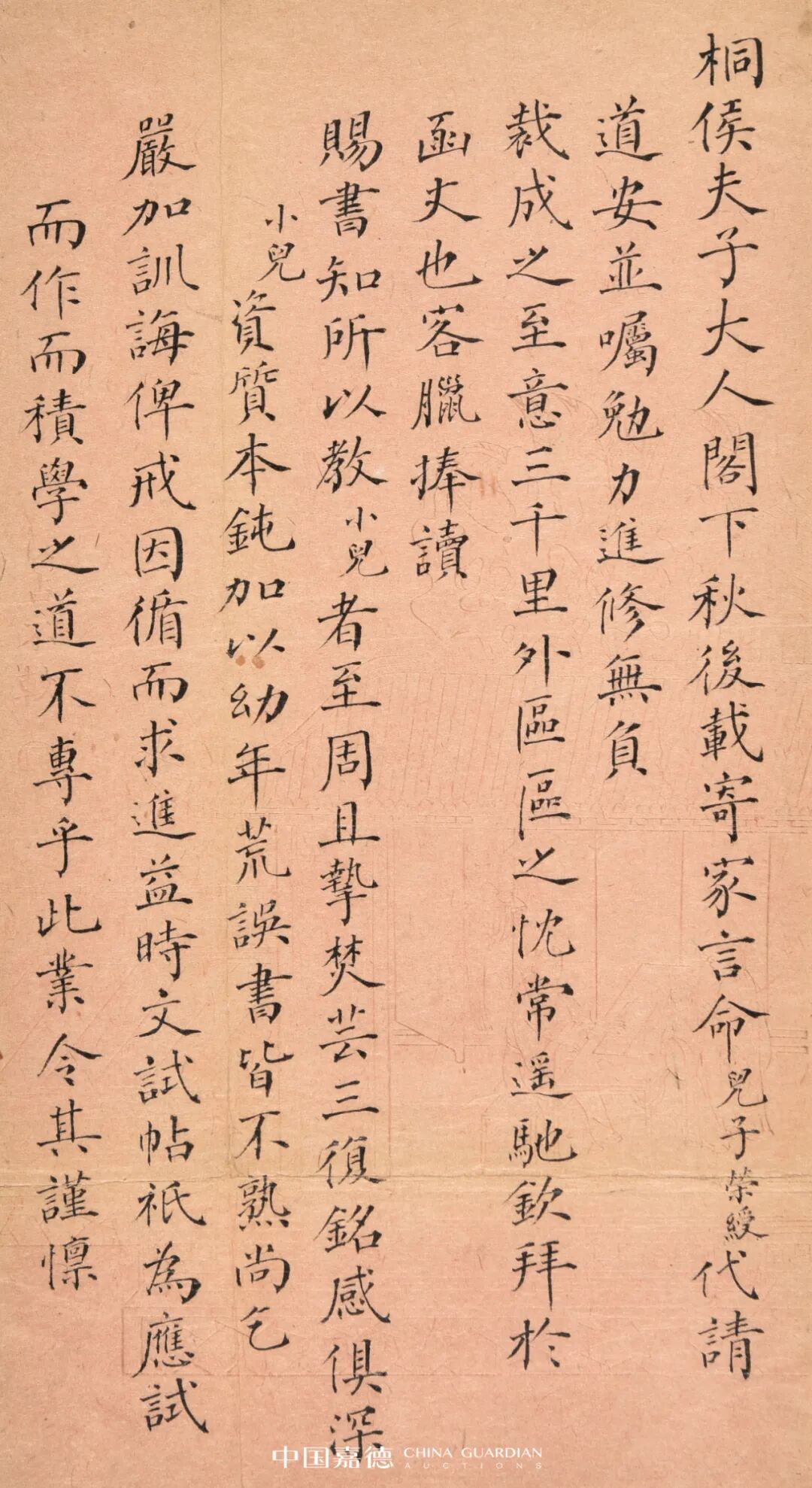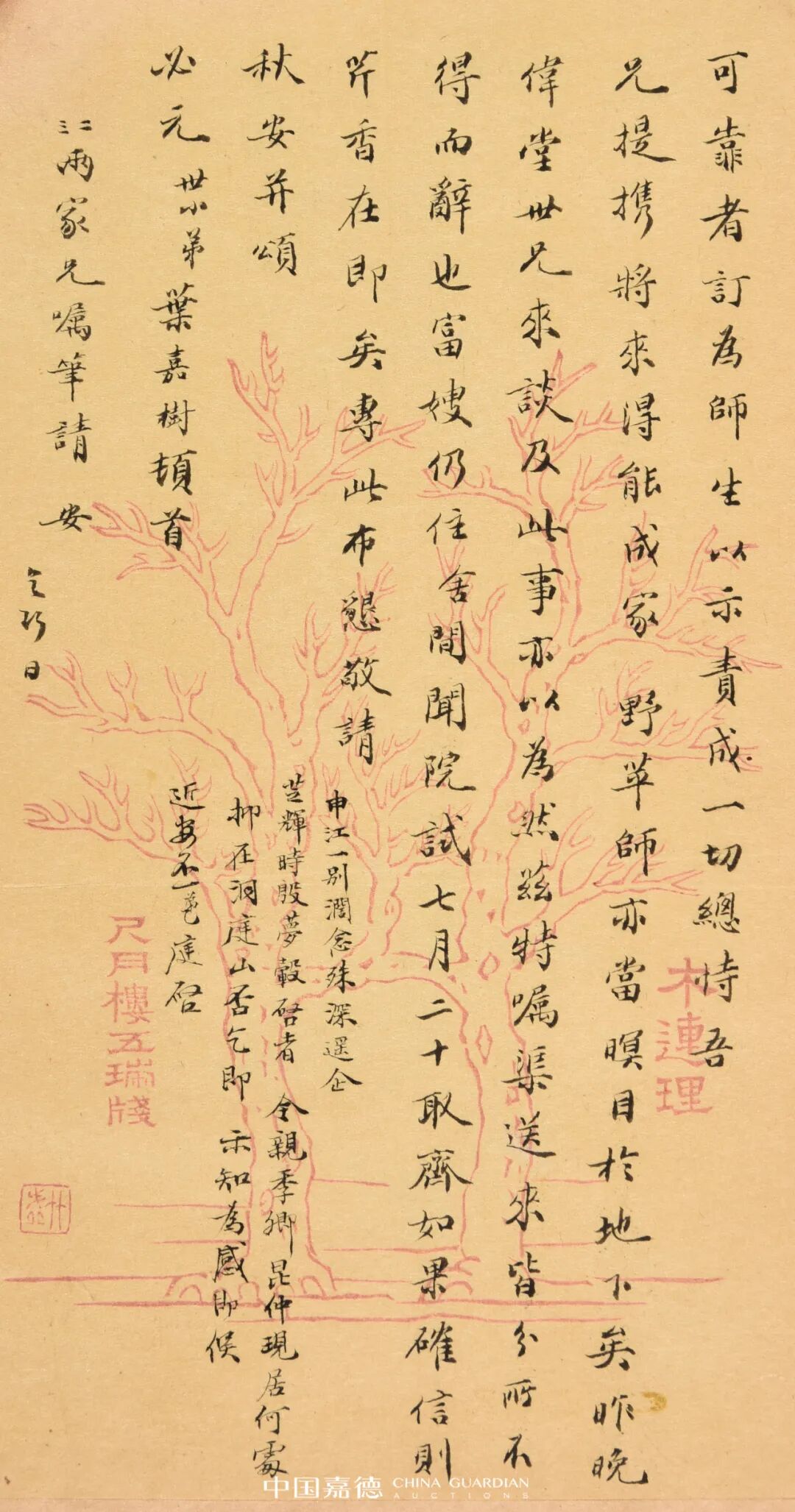 1、盛景璿致梁鼎芬函2通4页,论及抄诗、题扇面、书籍送寄等事。2、盛景璿致"清士我师"等人函2通3页,谈及牙疼月余、鉴赏其所作为,言"小孩学步,初行仅一两步,及壮何止千万步。今公之始,虽三两步,其继安知不百十步而至千万步耶"。盛景璿(1880-1929),字季莹,一字淡逋,号芰舲、雪友、濠叟、遁斋、剑气楼,广东番禺人。热衷于文史和书画,喜藏书,其"濠堂"藏书楼有藏书数十架,间有宋元残本,另有广东地方史志、诗文及书画。晚年藏书被同里藏书家陈融所购,归于"黄梅华屋"。●请您于参与拍卖活动当日24小时前完成账户注册并交纳保证金。●E-BIDDING提供预约鉴赏服务,敬请关注“中国嘉德网拍”服务号预约。鉴赏地点:嘉德艺术中心三层、B2层。●中国嘉德为竞买人提供查看拍卖标的实物的条件,务请竞买人亲自审看。本公司对拍卖标的不承担瑕疵担保责任。请拨打1501000622015910807786![]()