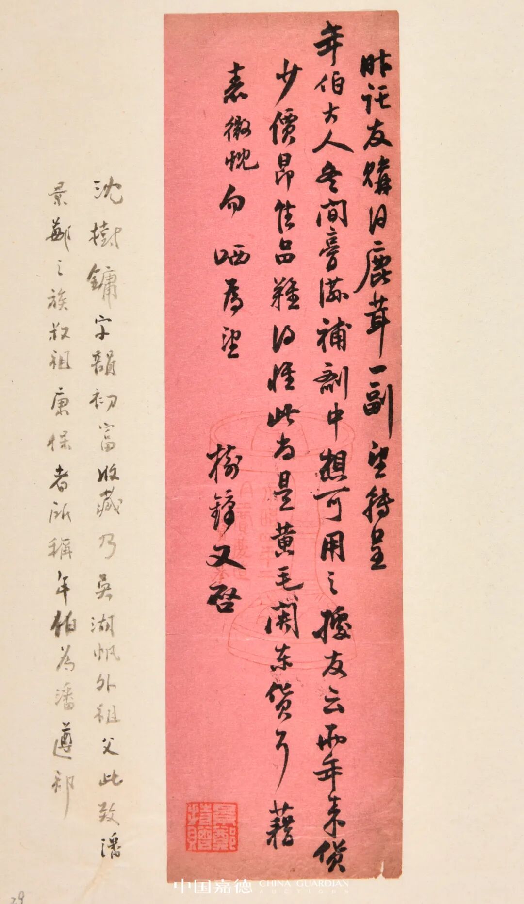 此函先后经潘景郑、郑逸梅递藏,钤有"景郑持赠"印章,应为潘景郑赠与郑逸梅,并有郑逸梅边题注明作者生平与藏札信息。据郑逸梅边题,此件为沈树镛致潘景郑族叔祖潘康保函,信中提及的"年伯大人"即潘康保父亲潘遵祁。沈树镛(1832-1873),字均初,号郑斋,松江川沙人。清咸丰九年(1859)举人,官至内阁中书。生平收藏金石碑帖甚丰,考订精辟。著有《汉石经室丛刻目录》、《汉石经室跋尾》,与赵之谦合编《续寰宇访碑记》等。潘康保(1834-1881),原名贵生,字良士,号秋谷、青芝山人,江苏苏州人。祖父潘世璜是潘世恩的堂兄。清同治元年(1862),考取咸安宫教习,后历任湖北嘉鱼、钟祥、麻城和浙江诸暨知县,补用知府。富收藏,尤好金石古籍。著有《迦兰陁室诗钞》。![]()