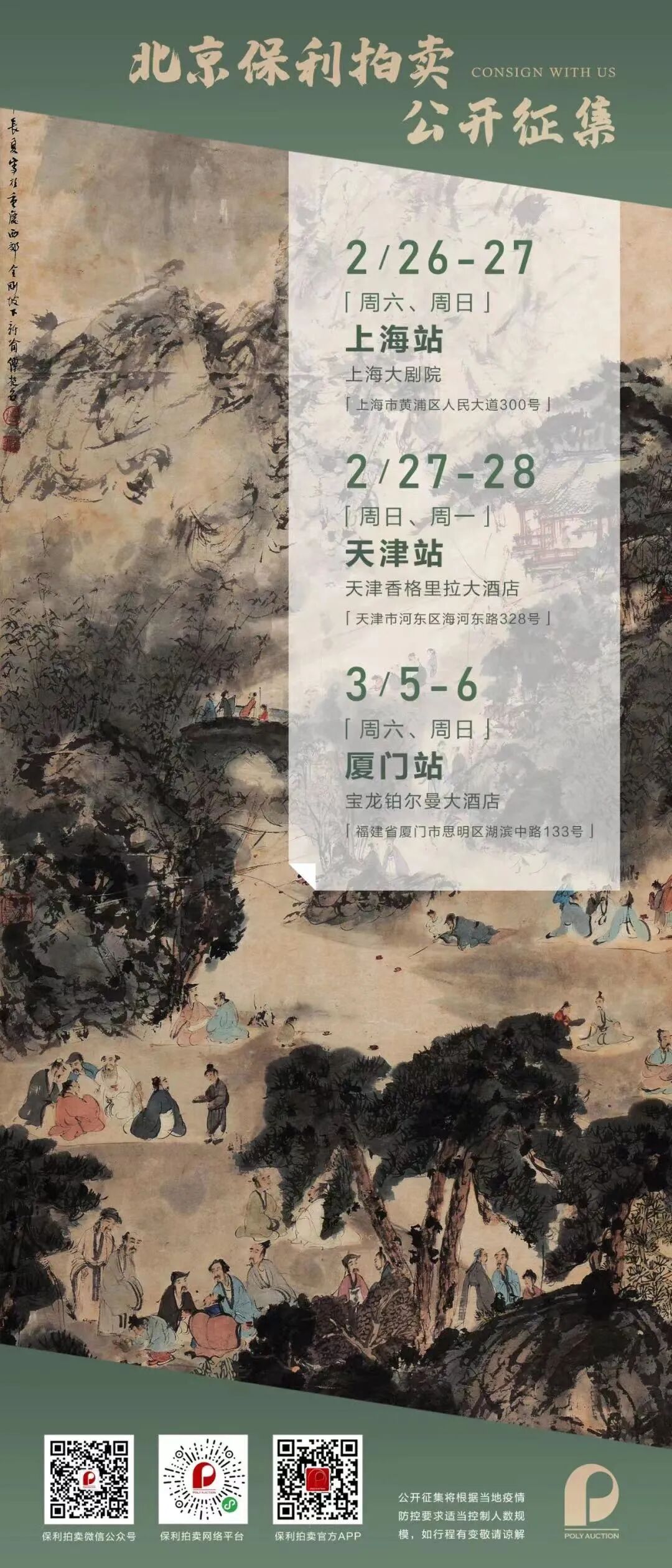2月底3月初,保利拍卖将在上海、天津、厦门三座城市开展春季拍卖会公开征集活动,中国书画部业务专家届时将赶赴上述城市,为当地藏家与收藏爱好者提供专业优质的艺术品估值服务与市场态势咨询,分享书画收藏的乐趣。