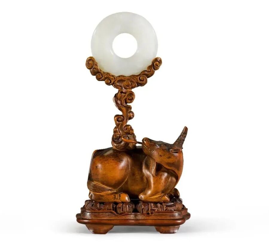 清十八世纪 木雕犀牛望月架及白玉璧