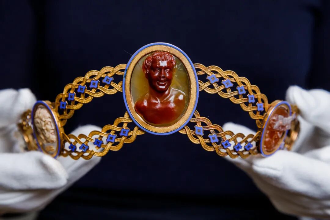 这两顶皇冠为套装,可一同佩戴,镶嵌刻有古代头像的宝石,据信能赋予佩戴者各种精神价值,如英雄主义、忠诚和爱。两顶皇冠于英国私人收藏递藏至少150年,仍然保存于原装巴黎制造的皮盒中,并将于本年12月7日于伦敦蘇富比瞩目上拍,估价分别为200,000至300,000英镑及100,000至200,000英镑。