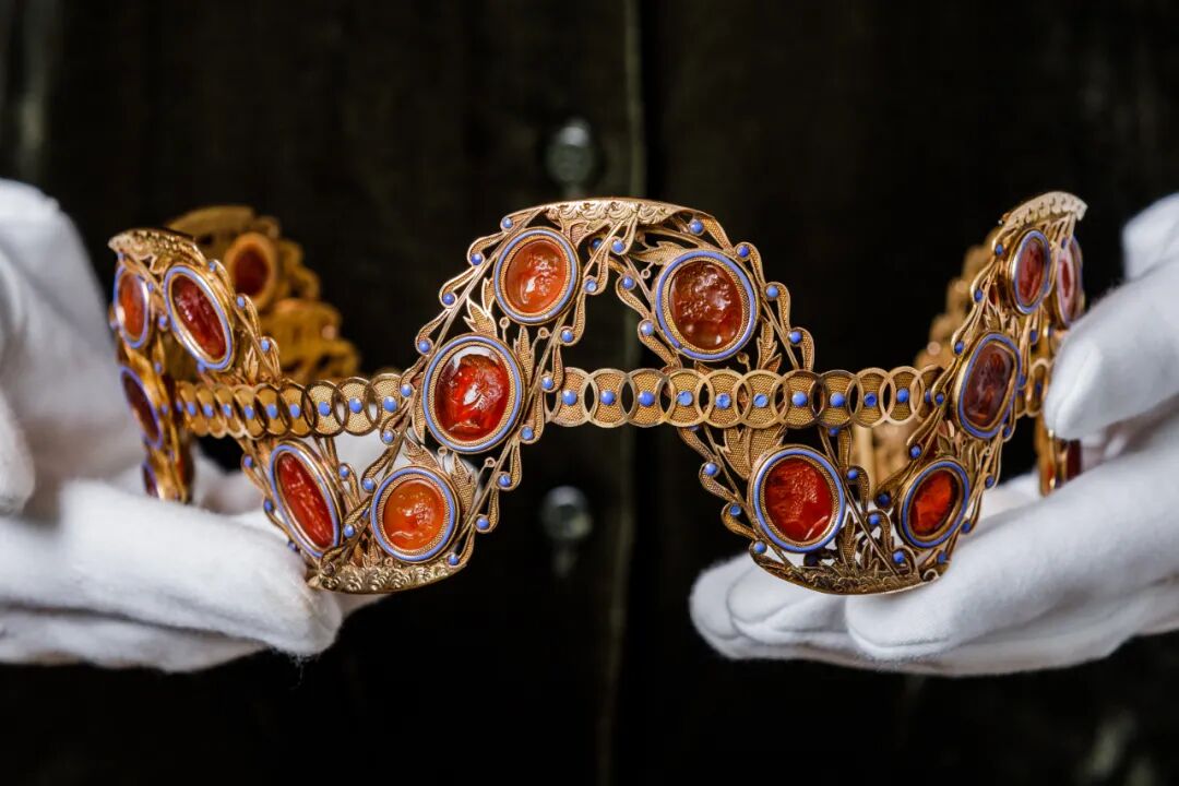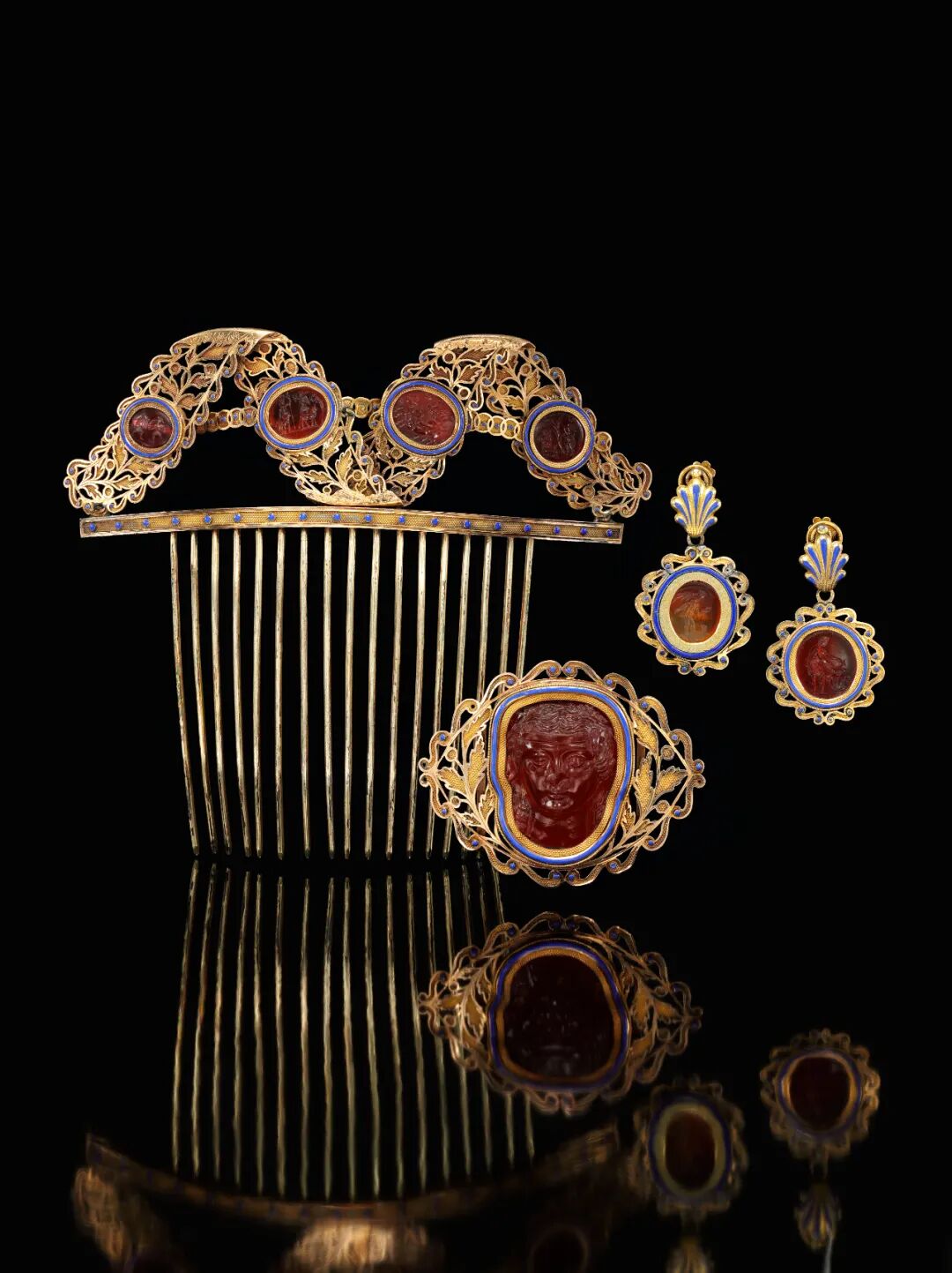 黄金饰珐琅镶红玉髓皇冠,约 1808 年制,部分宝石浮雕或为古物,配同款耳坠一对、