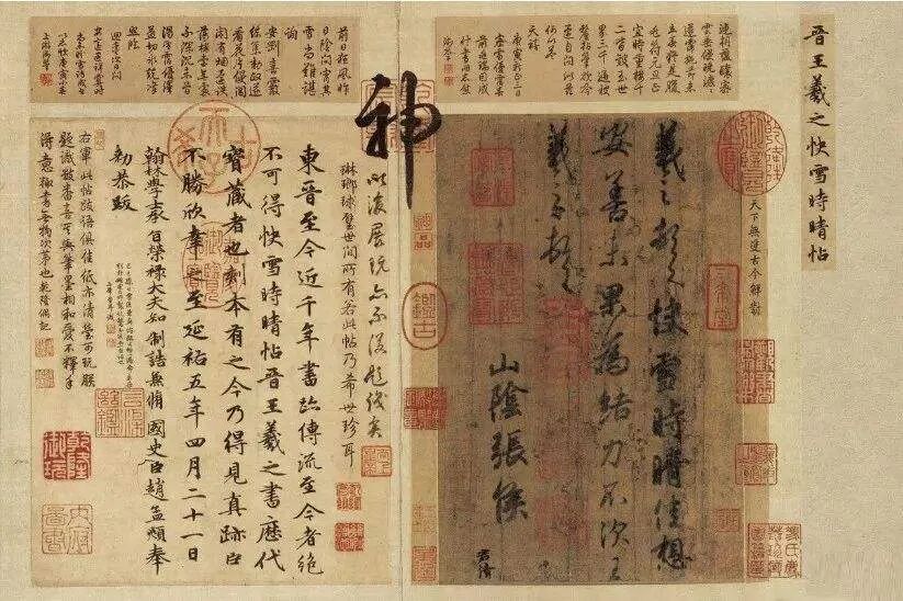 这是被乾隆祸祸得最惨的书法之一。不仅盖满了乾隆的各种“口红水印”,旁边还写了个巨大的“神”字,还是挨着书圣的真迹写字。作品里盖这么多比字大的章,实在是破坏作品的整体美感。