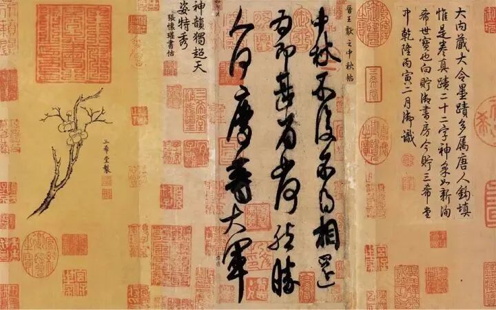 老爸的作品被糟蹋完,儿子的作品也惨遭毒手。王羲之儿子王献之的《中秋帖》享受到了皇上同样的礼遇——弹幕章。千秋书法神品,却整体红色,似乎就要表现出要明艳、花样多、不能有空白的感觉。