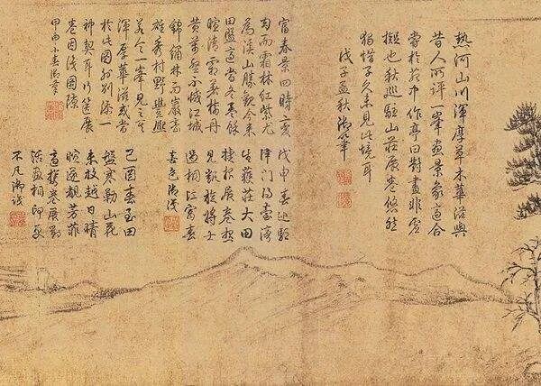 不仅如此,他还超级喜欢亲笔题写观后感,本来古代画作讲究的是意境、留白。结果乾隆一看到白色部分就来劲了……于是乾隆时期大部分名画就像被拔过罐儿似的。