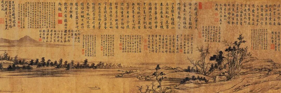 乾隆是多么喜欢《富春山居图》,从满屏的题字就看得出来。挺长一幅画卷空白处都被他写满了,创下了“中国历史上同一人在同一画中题跋最多”的记录。古代文人画讲究的“留白”在乾隆眼里根本不存在。甚至,空白处的题跋已经不能令乾隆满足,于是,画面的山上体内,竟然也填上了打油诗。