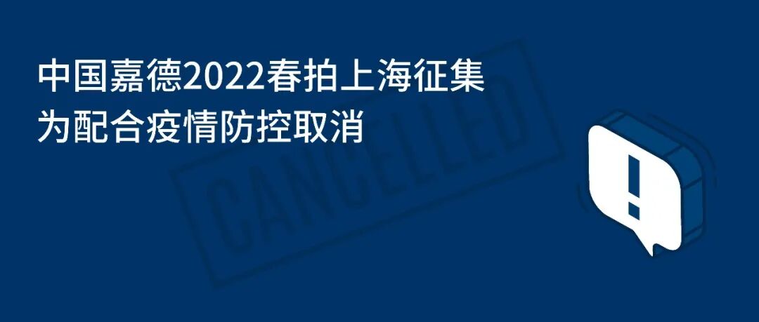 为配合疫情防控需要,原定于3月5日-6日在上海举行的中国嘉德2022春拍公开征集活动取消,对由此给您带来的不便,我们深表歉意,敬请谅解。中国嘉德2022春季拍卖会将于5月盛大启幕,春拍征集持续进行中,有送拍需求的藏家请致电中国嘉德驻各地办事处,联系送拍事宜。![]()