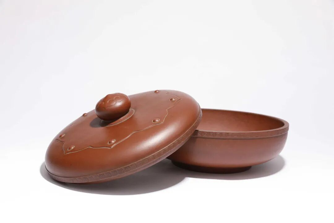 本品器形颇大,以上等紫泥为胎,烧结坚实。口沿与盖沿各饰以一圈回纹,钮及盖面各贴饰以柿蒂纹,整体线条简洁流畅,做工精细利落。底歀“姚氏作坊”,不见史载,但观此器,诚非良工名手不能为也。