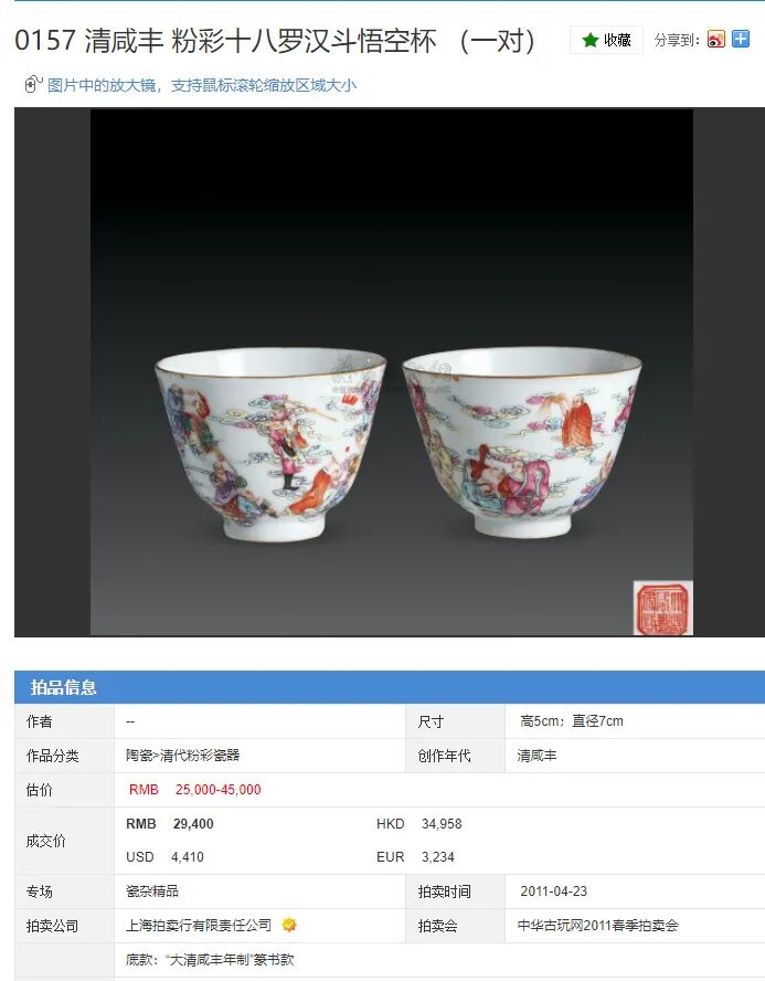 参阅:上海拍卖行2011年春拍 lot0157 “清咸丰 粉彩十八罗汉斗悟空杯(一对)”成交价RMB 29400