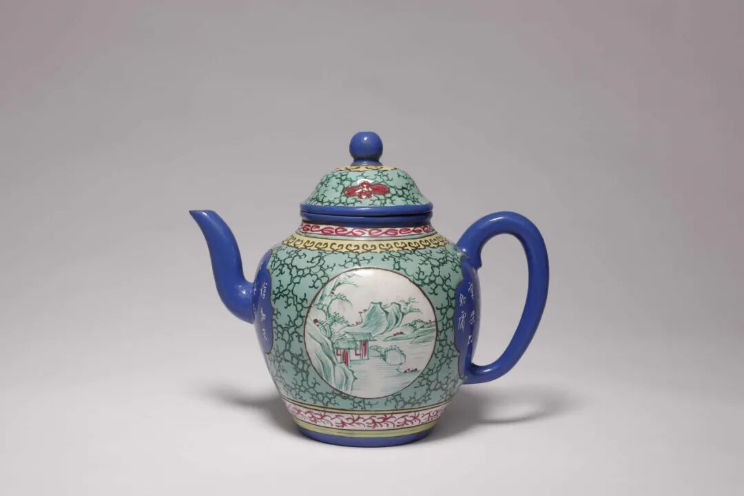 此宫灯满彩装饰,釉色肥厚,壶身上挺下敛,耸颈、三弯流、扣把长弧,截盖似笠帽,中竖椭圆钮,底呈假圈足,内钤“顺时听天”。整壶比例协调,气韵壮硕,简中显贵。