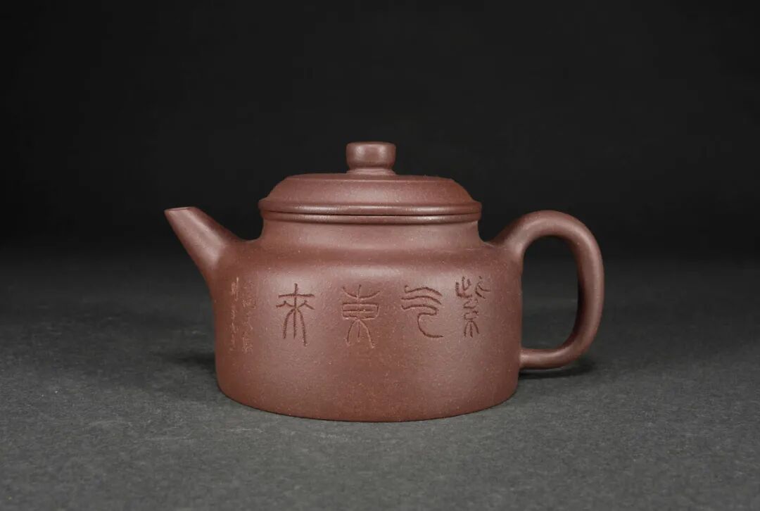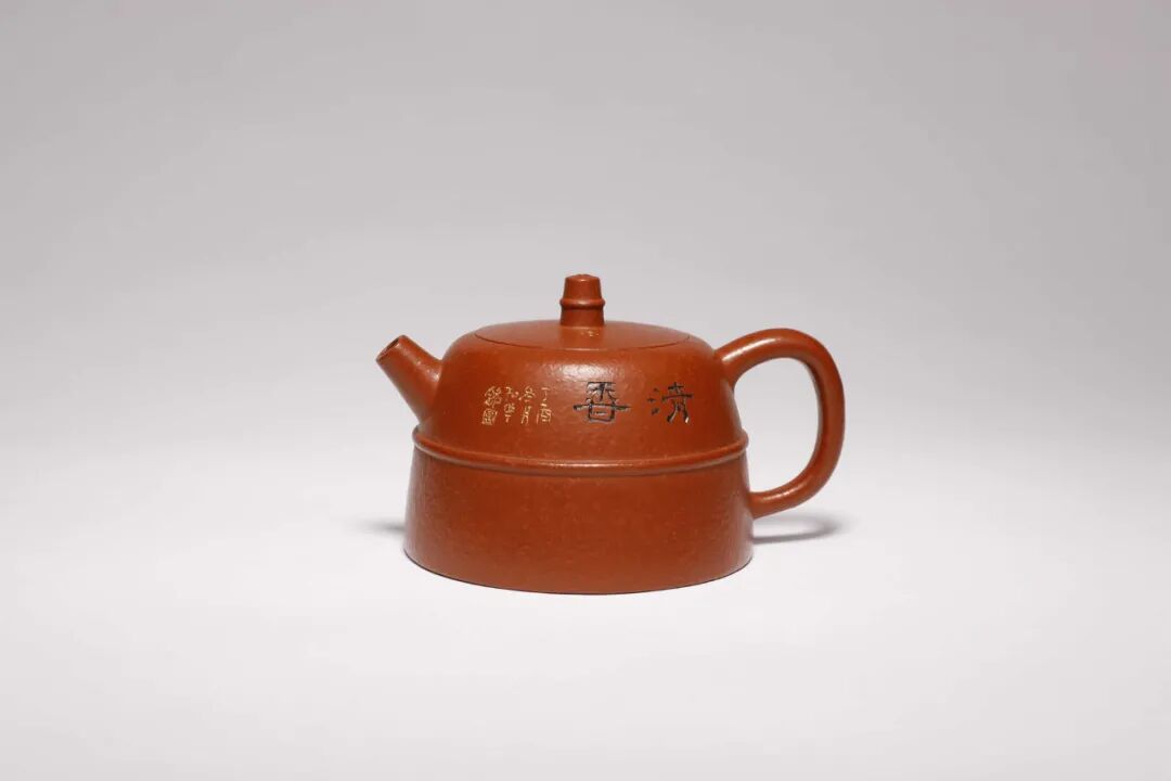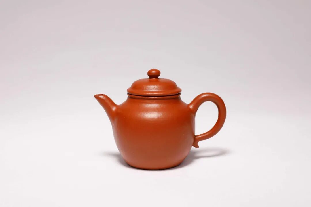 此壶泥色朱红,娇小可人,圈把垂耳,一弯弯,壶腹饱满,盖顶饰宝珠钮,修工细腻,线条过渡自然。静静而观有俊逸儒雅气度。卧足壶底,阴刻“秋水”二字,具清中时期典型特征。